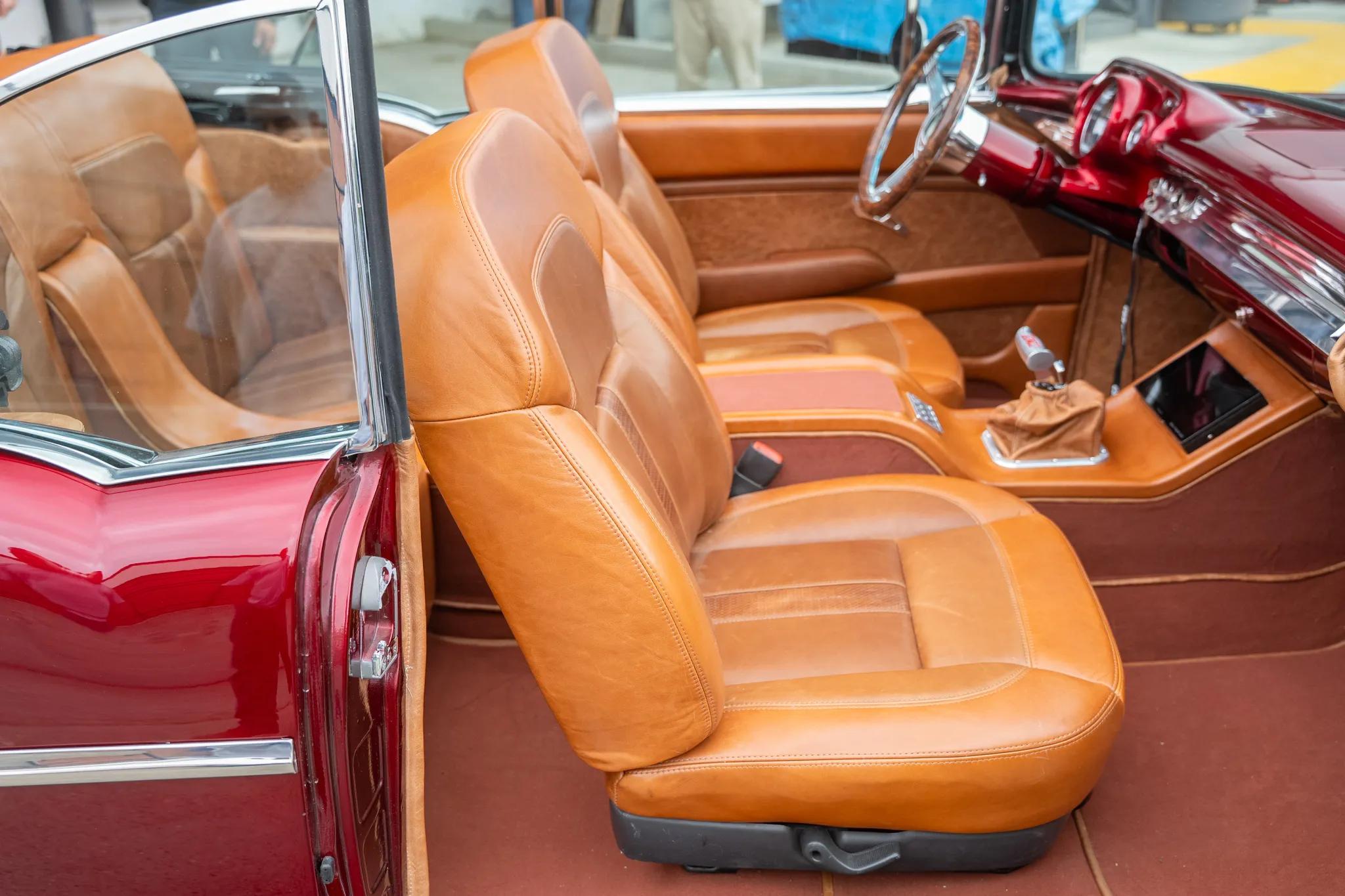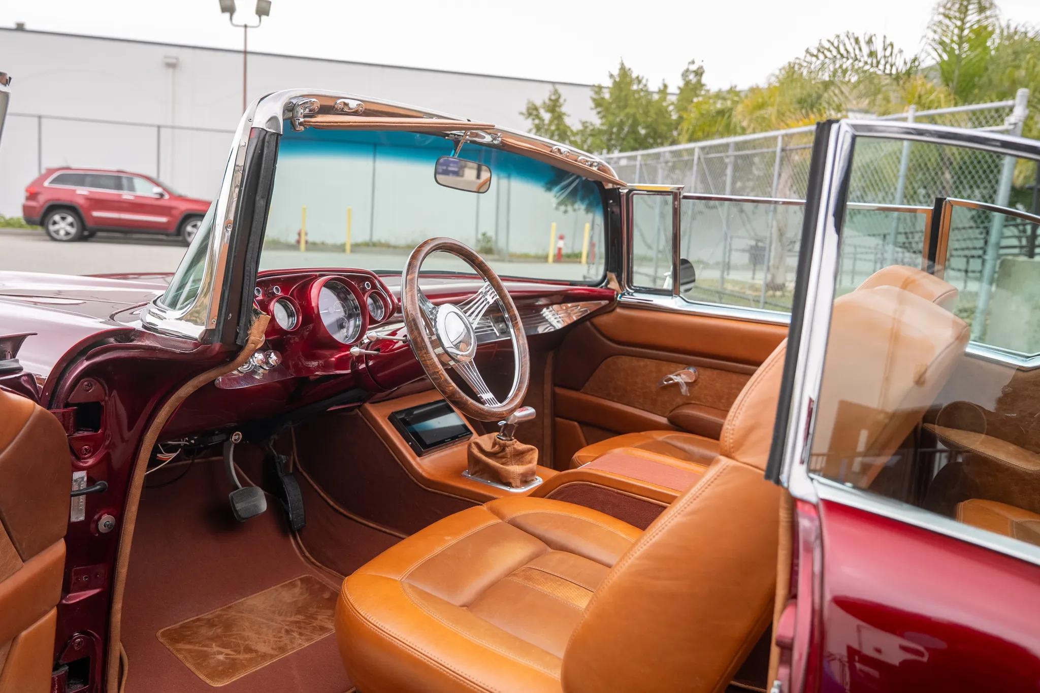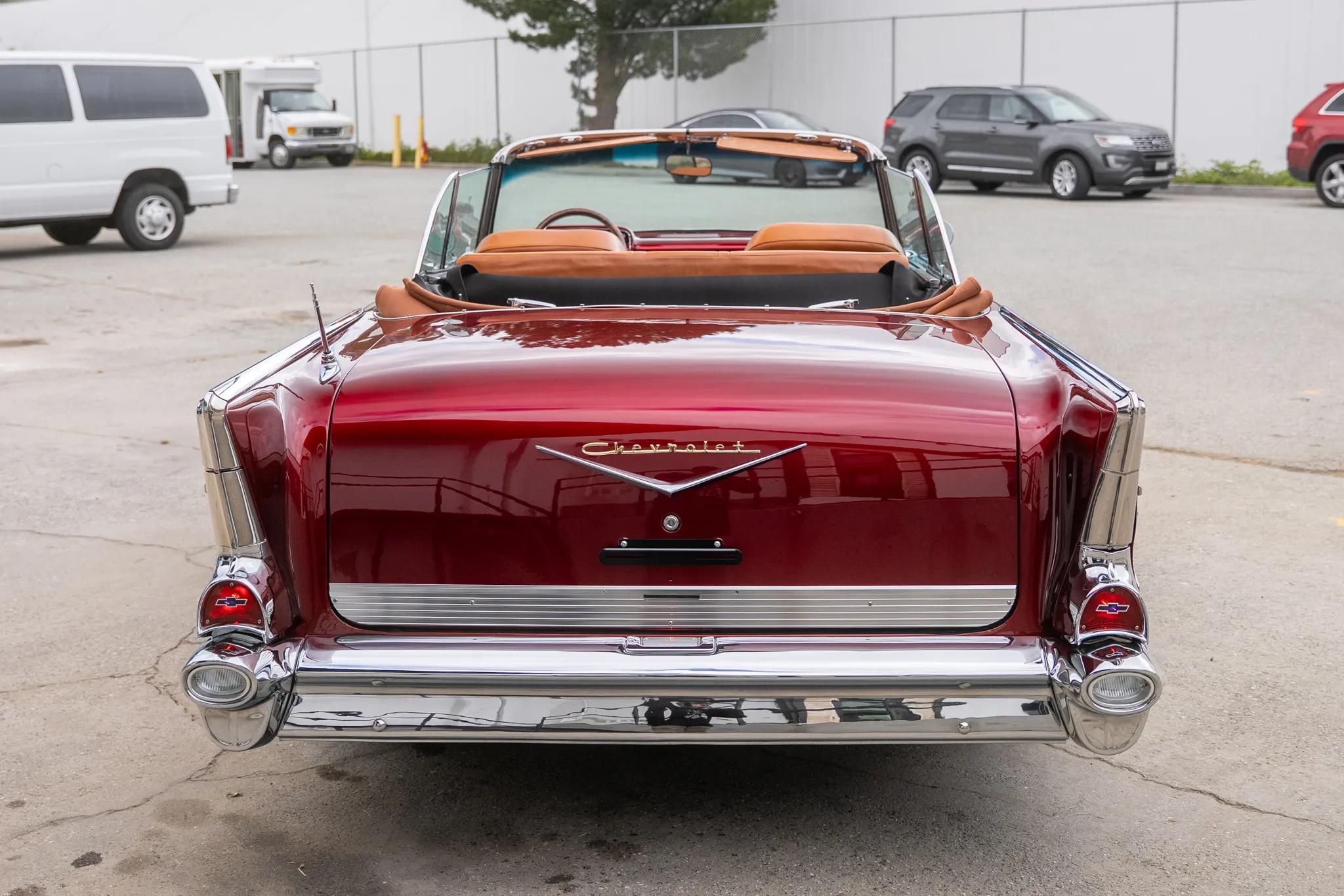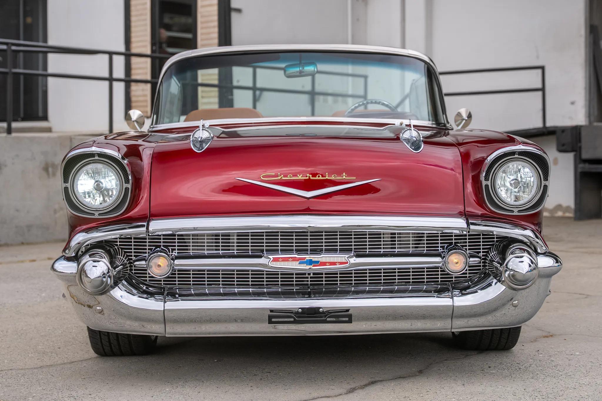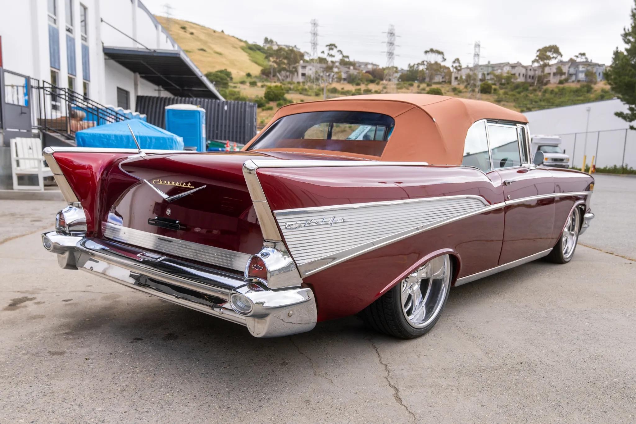 This 1957 Chevrolet Bel Air two-door convertible had refurbishment and modification work completed in 2025. The car is powered by a Blueprint 6.2-liter LS3 V8 crate engine linked with a TCI 4L60E four-speed automatic transmission and a 9" rear end with a limited-slip differential, and other work included refinishing the body in red over brown leather upholstery. Equipment includes a power-operated brown convertible top, a four-link rear suspension, tubular upper and lower control arms, a front sway bar, adjustable coilovers, 2" drop spindles, Intro 19 and 20" wheels, power-assisted four-wheel disc brakes, power steering, an 8" touchscreen Bluetooth stereo, cruise control, power windows, and later model front bucket seats.
