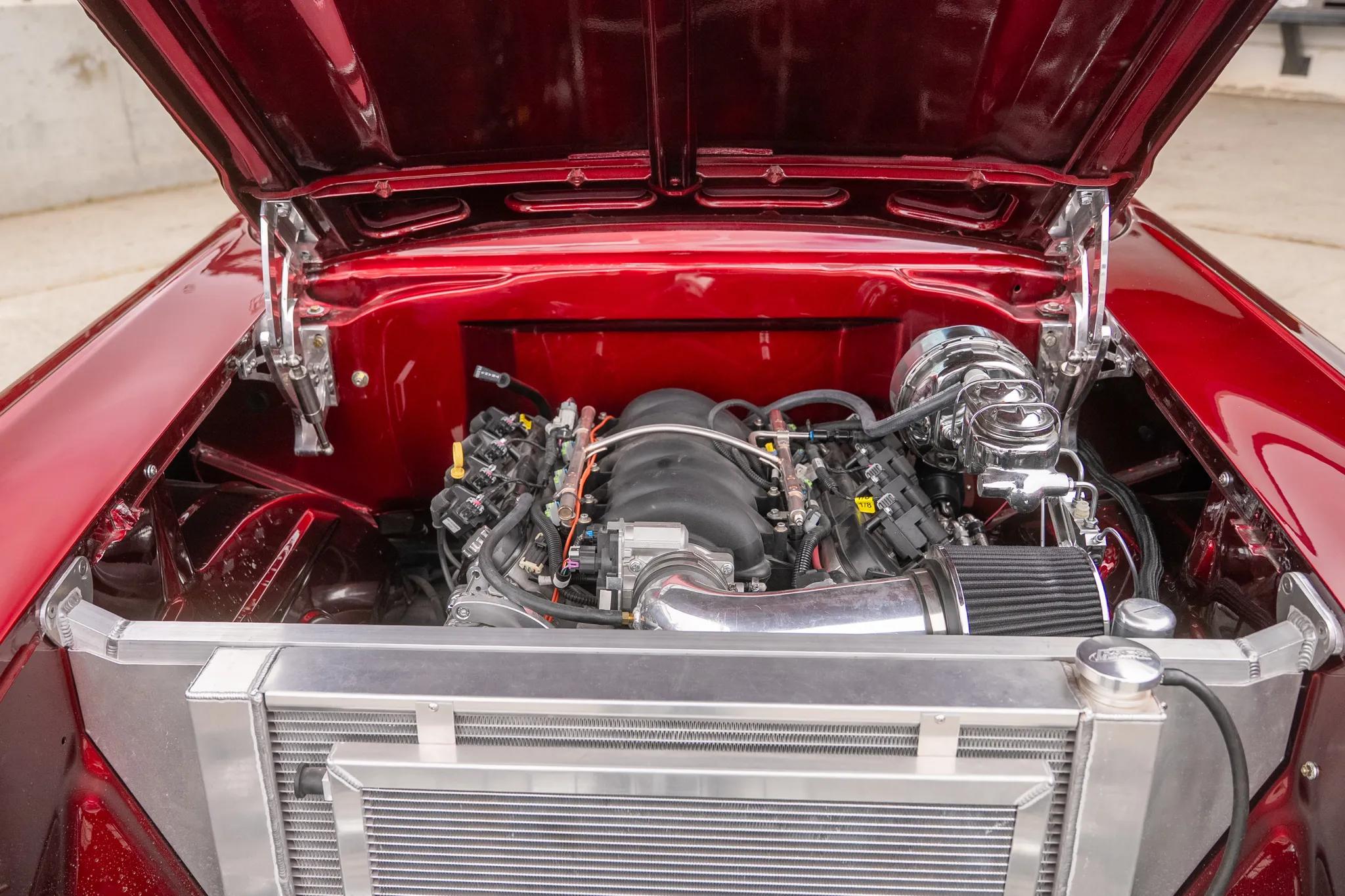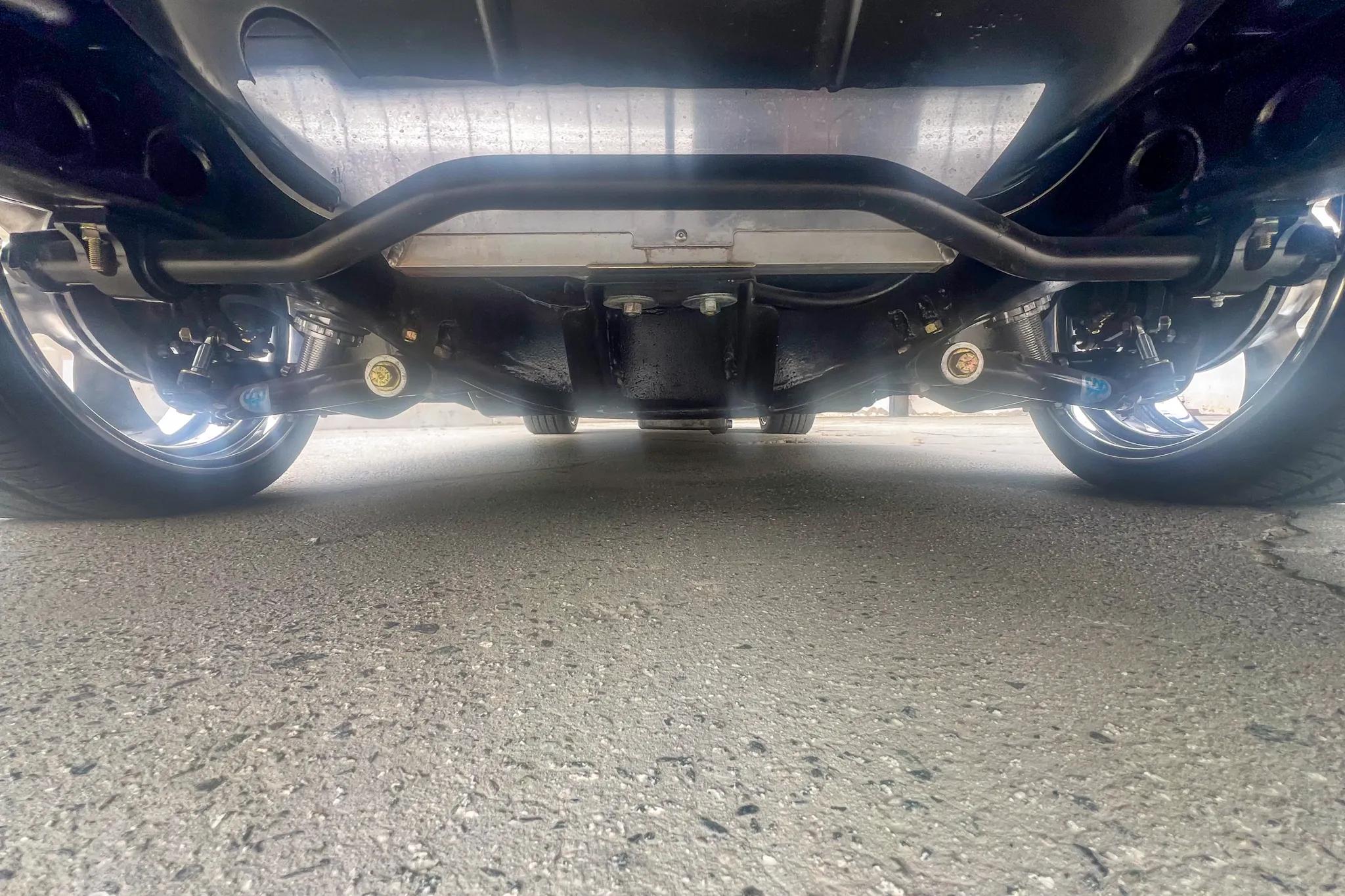 The Blueprint LS-style 6.2-liter V8 was installed in 2024 and sits ahead of a smoothed firewall. Features include an aluminum engine block, Blueprint LS3-style cylinder heads, Hedman Hussler exhaust headers, an aftermarket ECU, and an aluminum radiator with dual electric cooling fans. Power is sent to the rear wheels through a TCI 4L60E four-speed automatic transmission and a Currie 9" rear end with a limited-slip differential and 3.73:1 gearing. A coating has been applied to the underside, and the frame has been wrapped and reinforced. The fuel tank was replaced.