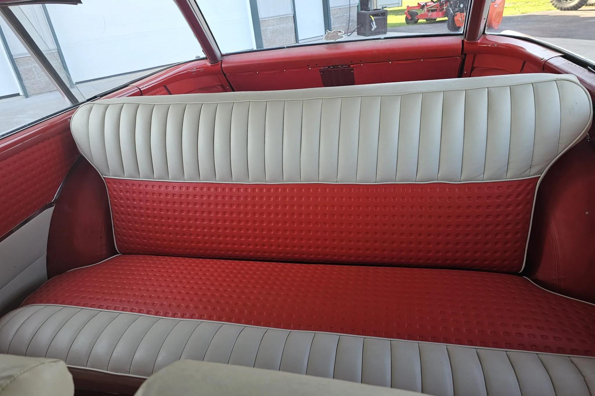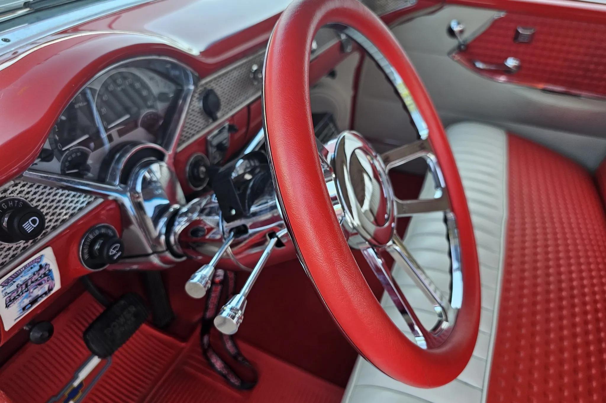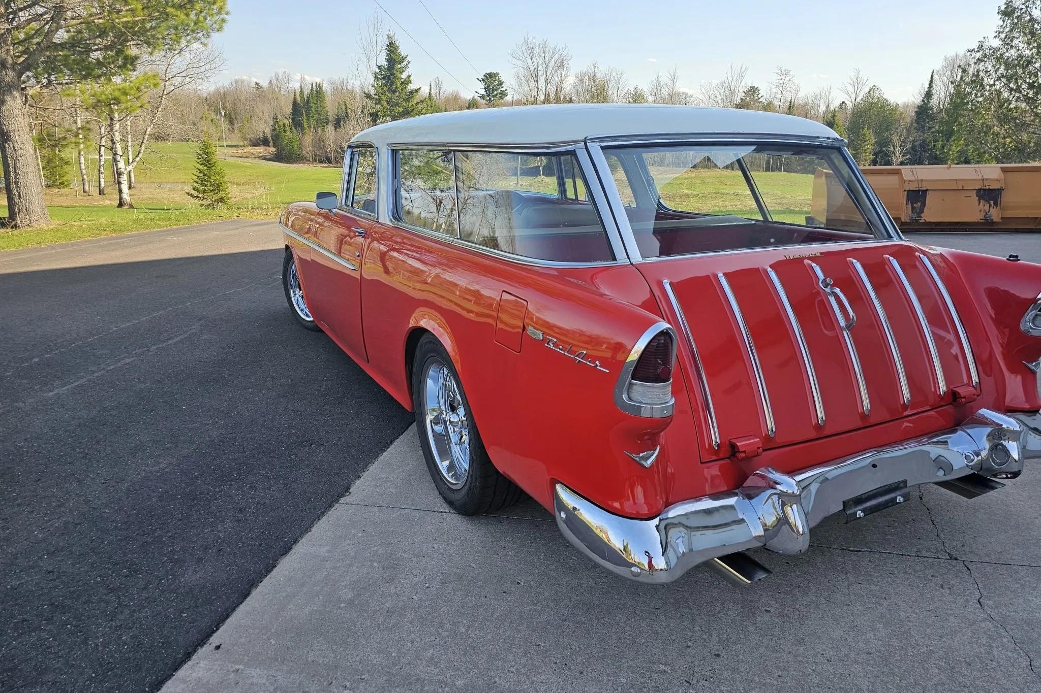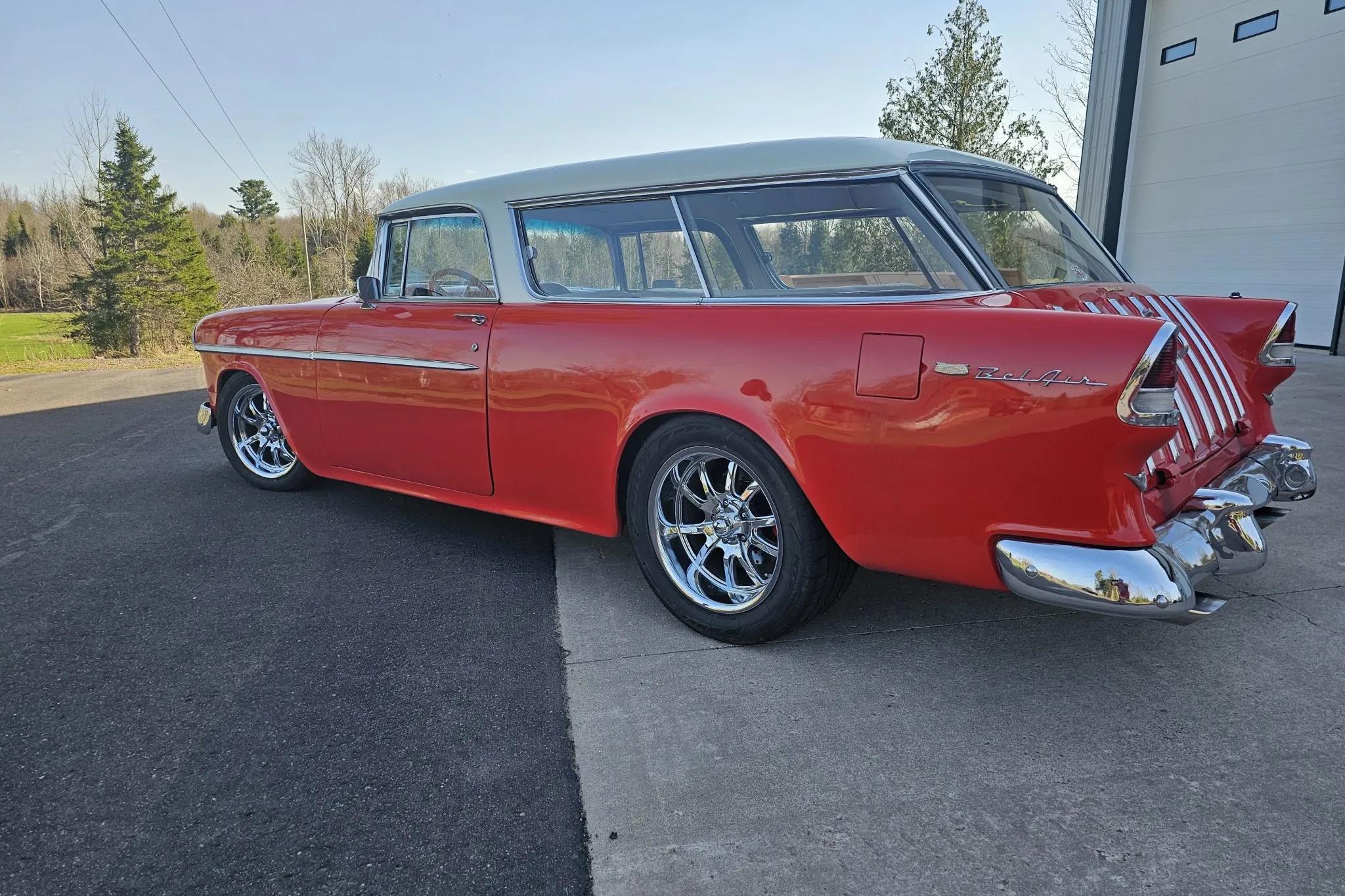 This 1955 Chevrolet Bel Air Nomad features a custom build that includes a 6.2-liter LS3 crate engine, a 4L65E four-speed automatic transmission, and RideTech coilovers with tubular control arms up front and a four-link setup out back. The body is finished in red and white and rides on 17" and 18" Ridler wheels mounted over Wilwood disc brakes.