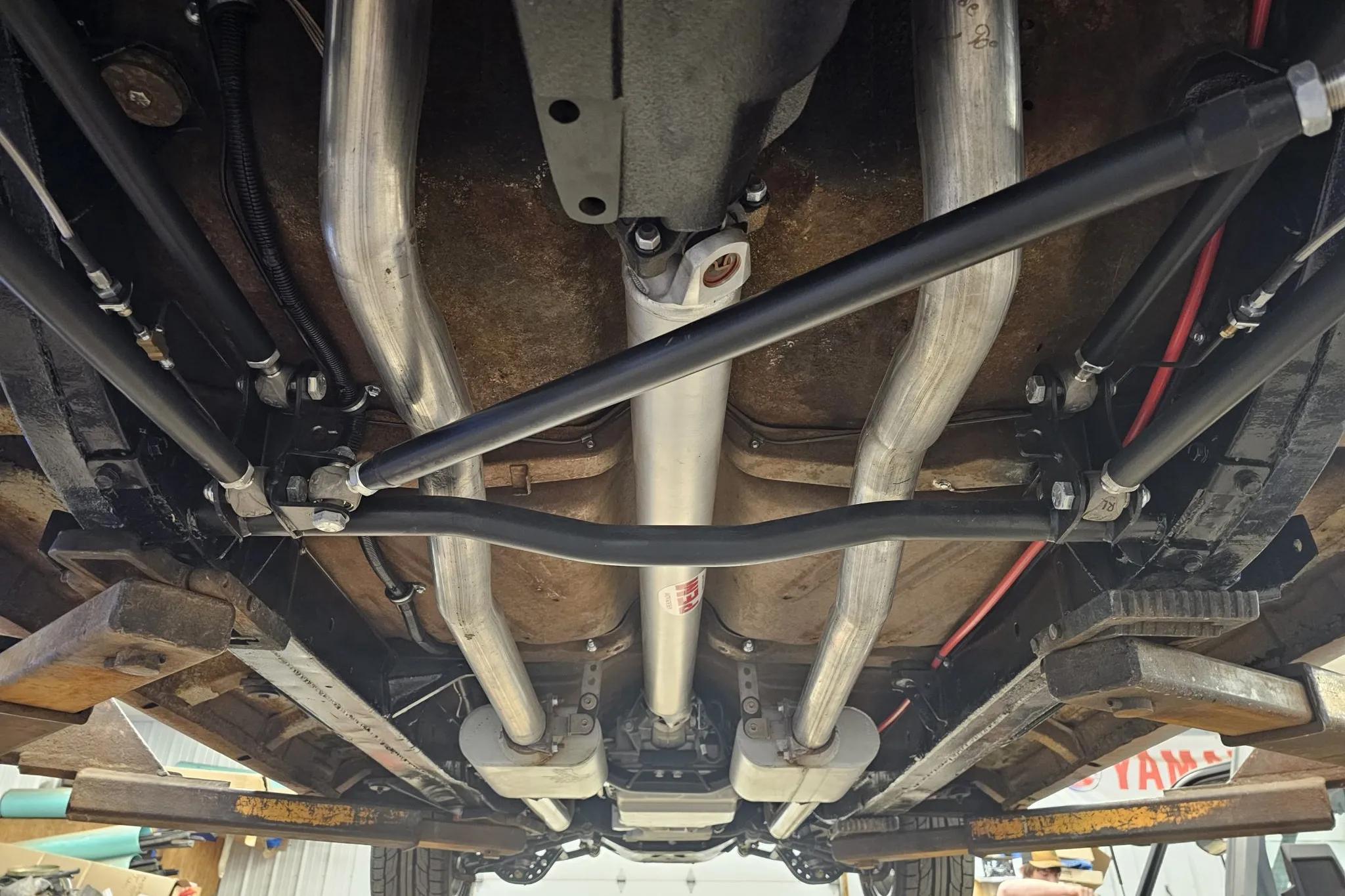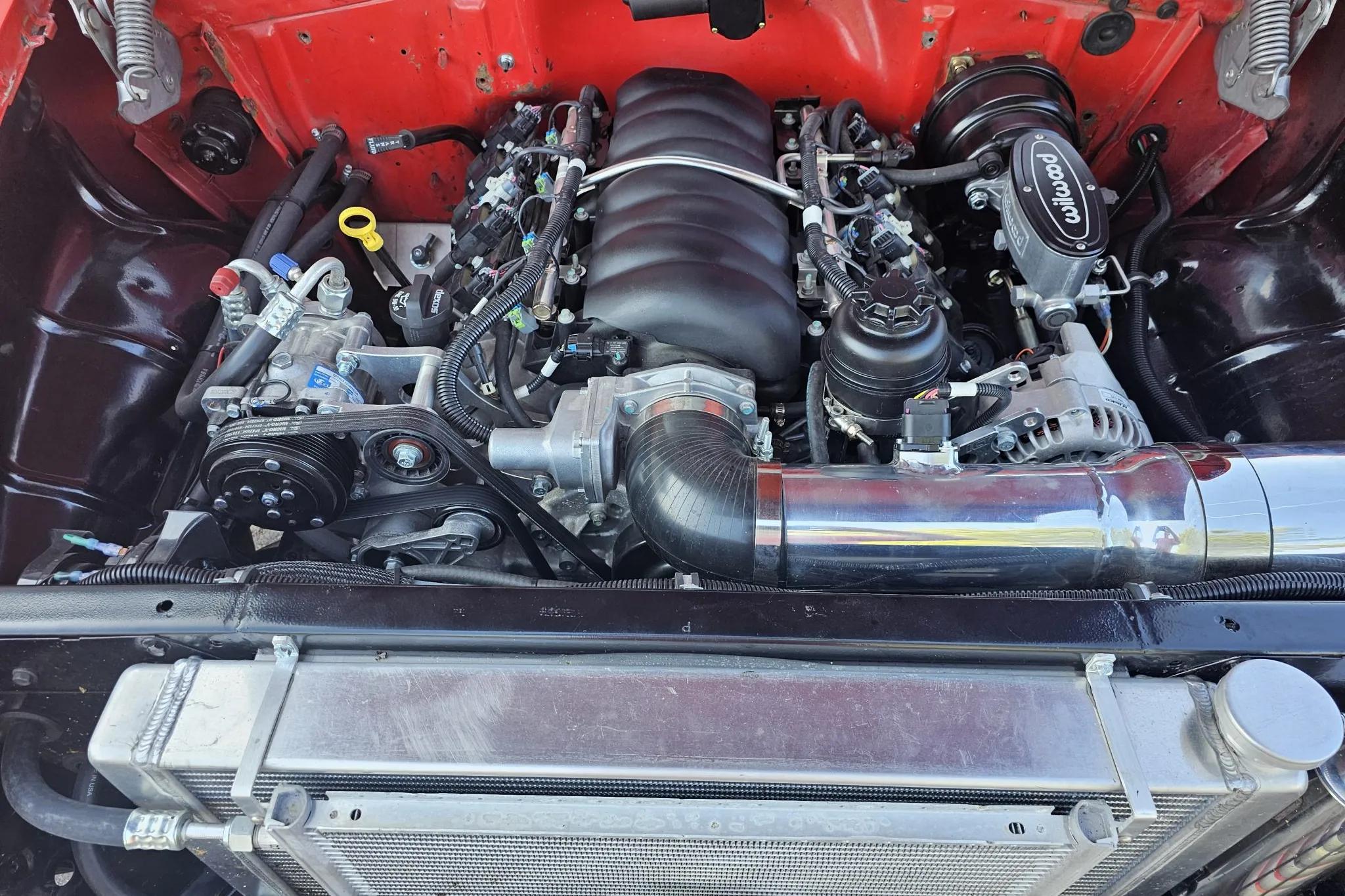 The 6.2-liter LS3 V8 crate engine was installed in 2023 along with a Griffin aluminum radiator, electric cooling fan, and a custom air intake assembly that draws air through the inner fender on the driver's side. Power is sent to the rear wheels through a 4L65E four-speed automatic transmission, a custom aluminum driveshaft, and a 12-bolt rear end with a 3.90:1 differential. The dual exhaust system uses FlowMonster mufflers.