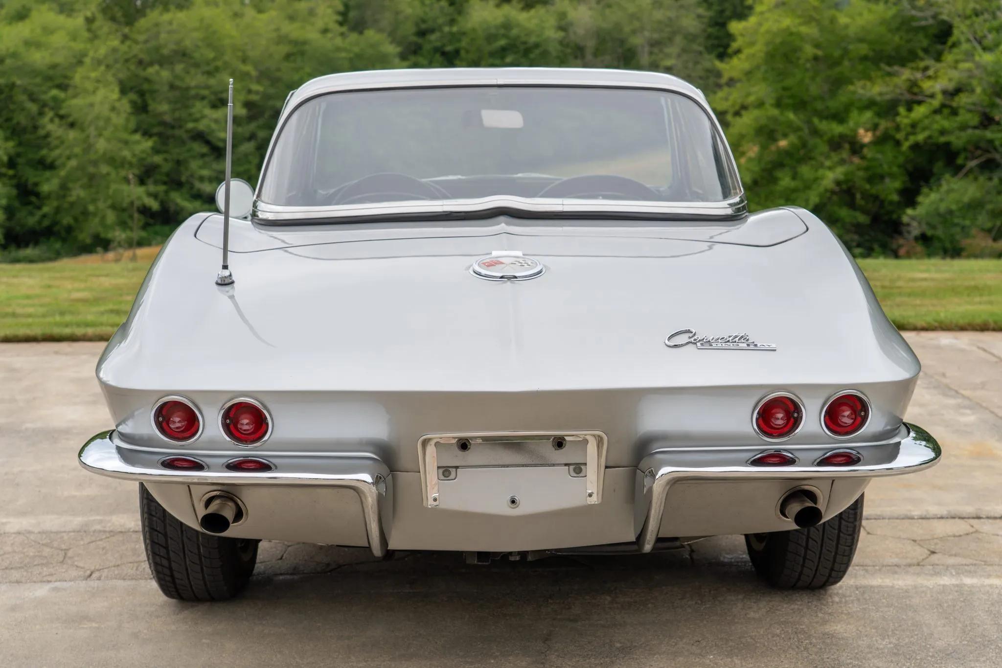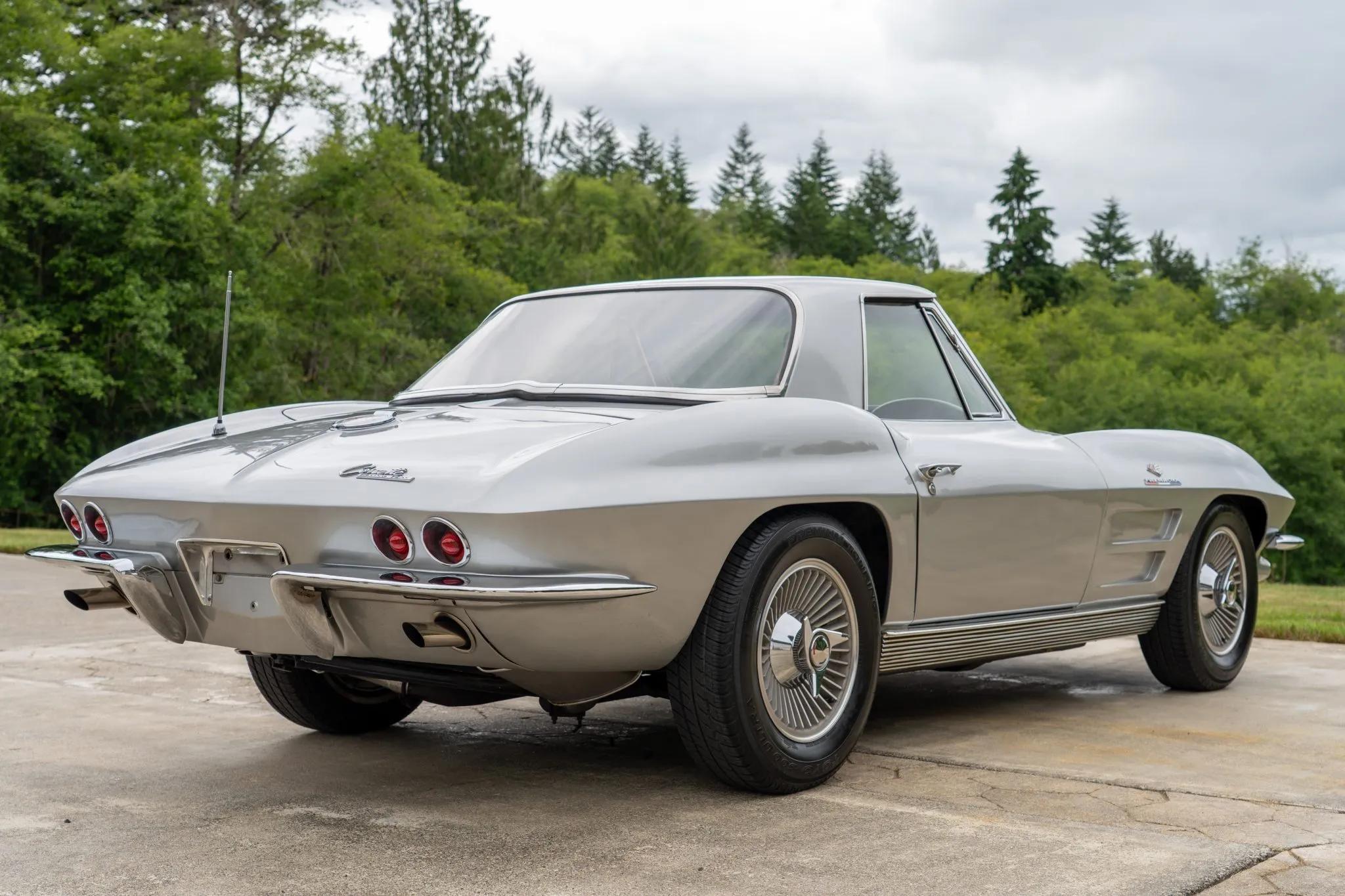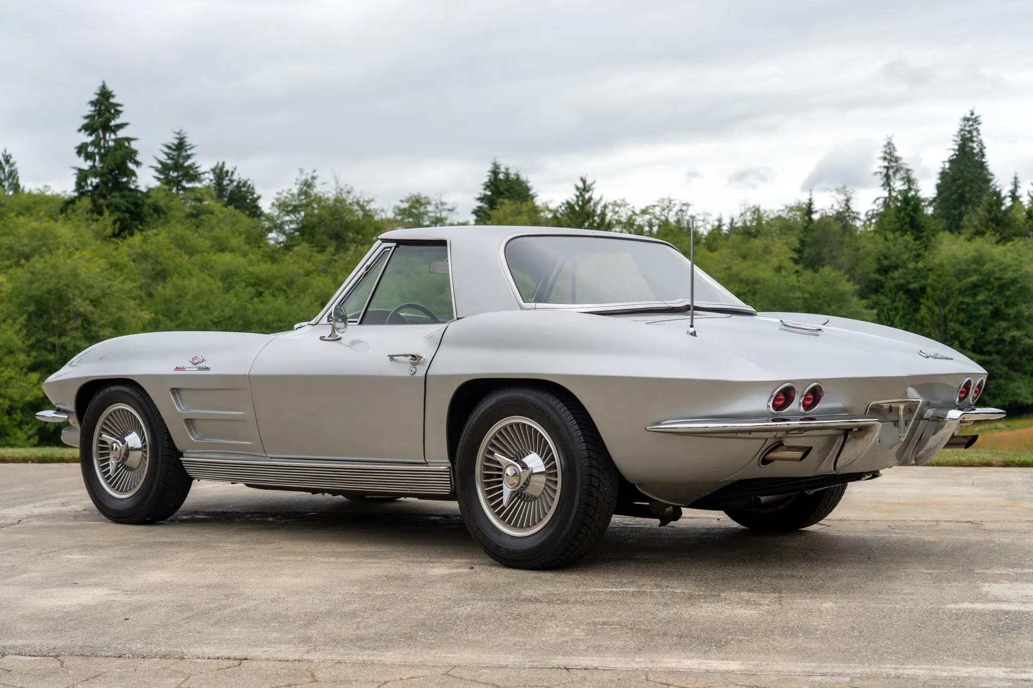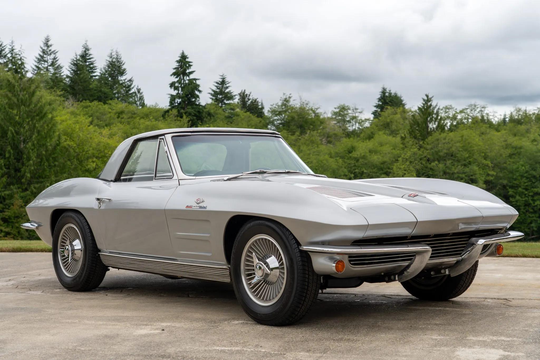 This 1963 Chevrolet Corvette convertible is powered by a fuel-injected 327ci L84 V8 paired with a four-speed manual transmission and finished in silver over black upholstery. Features include a removable hardtop, a black convertible soft top, 15" turbine-style knock-off wheels, a Positraction differential, power windows, an AM/FM radio, and concealed headlights. The Rochester mechanical fuel injection unit was rebuilt in 2025.The fiberglass body is finished in Sebring Silver and features a removable hardtop, a black convertible soft top, flip-up headlights, fender vents, quad tail lamps, chrome bumperettes, and dual exhaust tips exiting through the rear valance. The 15" turbine-style knock-off wheels are fitted with 205/70 Toyo tires. The C2 features fully independent suspension with upper and lower control arms at the front and a three-link setup with a transverse leaf spring at the rear. Braking is handled by four-wheel drums.