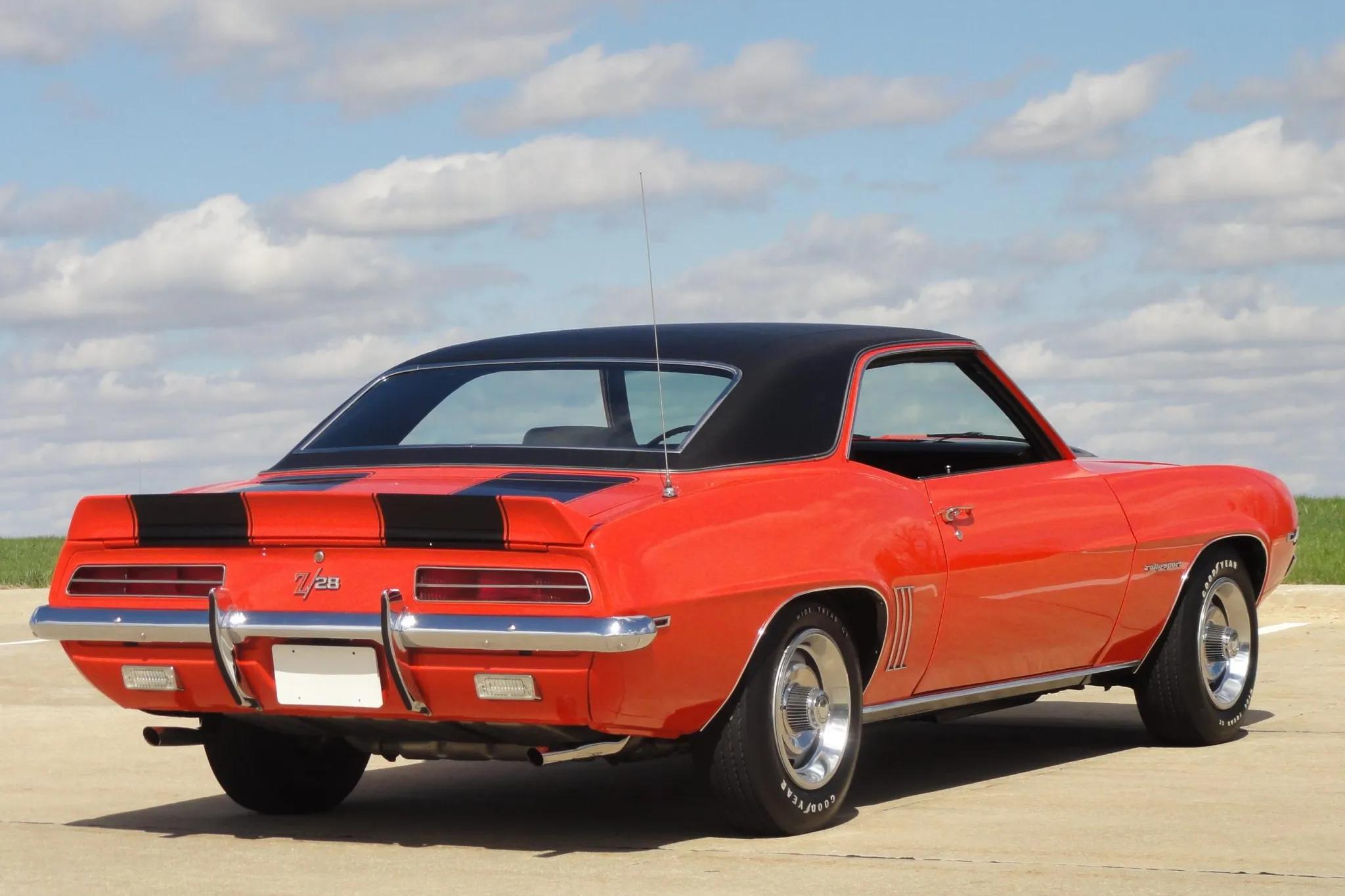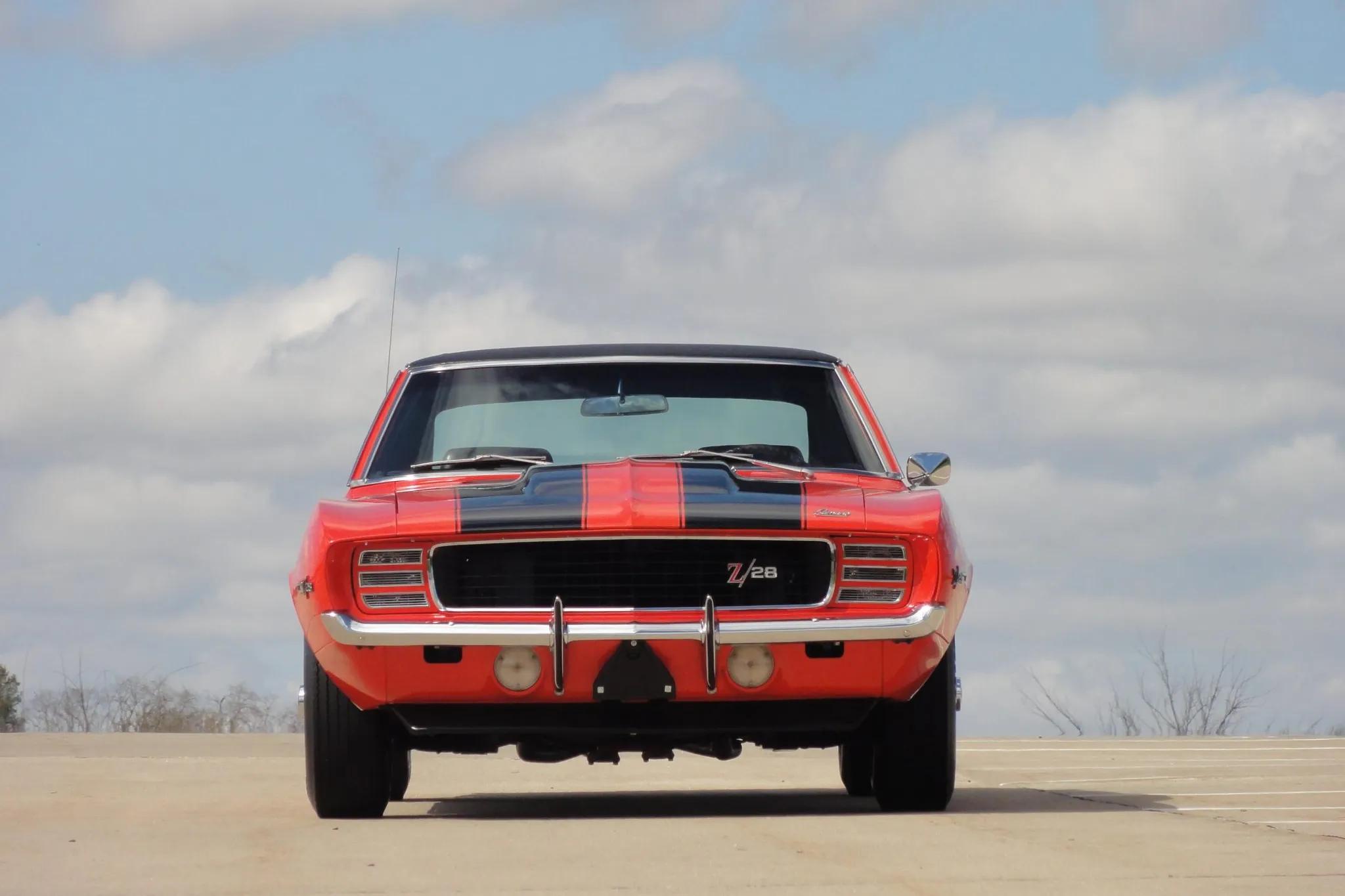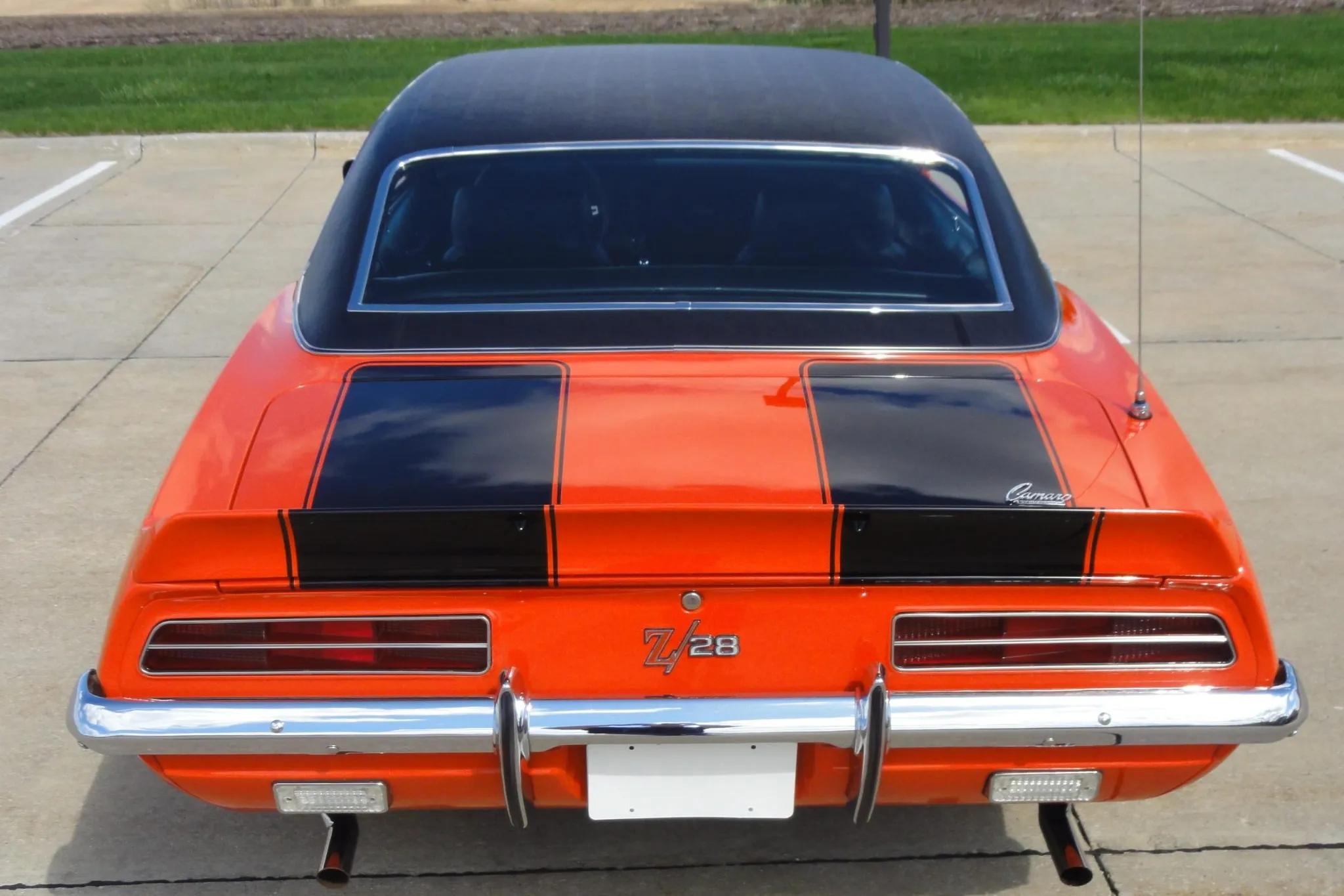 This 1969 Chevrolet Camaro Z/28 coupe was first delivered to Boggess Chevrolet in Madisonville, Kentucky, and was refurbished in 2008. The work included refinishing the body in Hugger Orange with black stripes and a black vinyl roof, along with re-trimming the interior in black and ivory houndstooth upholstery. Power is provided by a 302ci V8 paired with a four-speed manual transmission and a Positraction differential. Features include a cowl induction hood, an RS-style grille with concealed headlamps, 15" Rally wheels, a dual exhaust system, a center console, an AM/FM radio, and power-assisted front disc brakes.