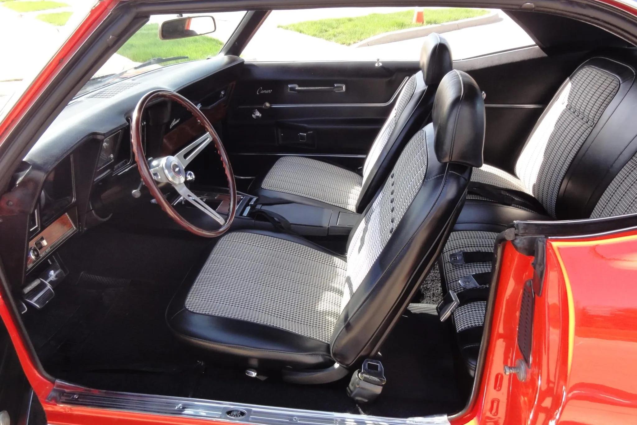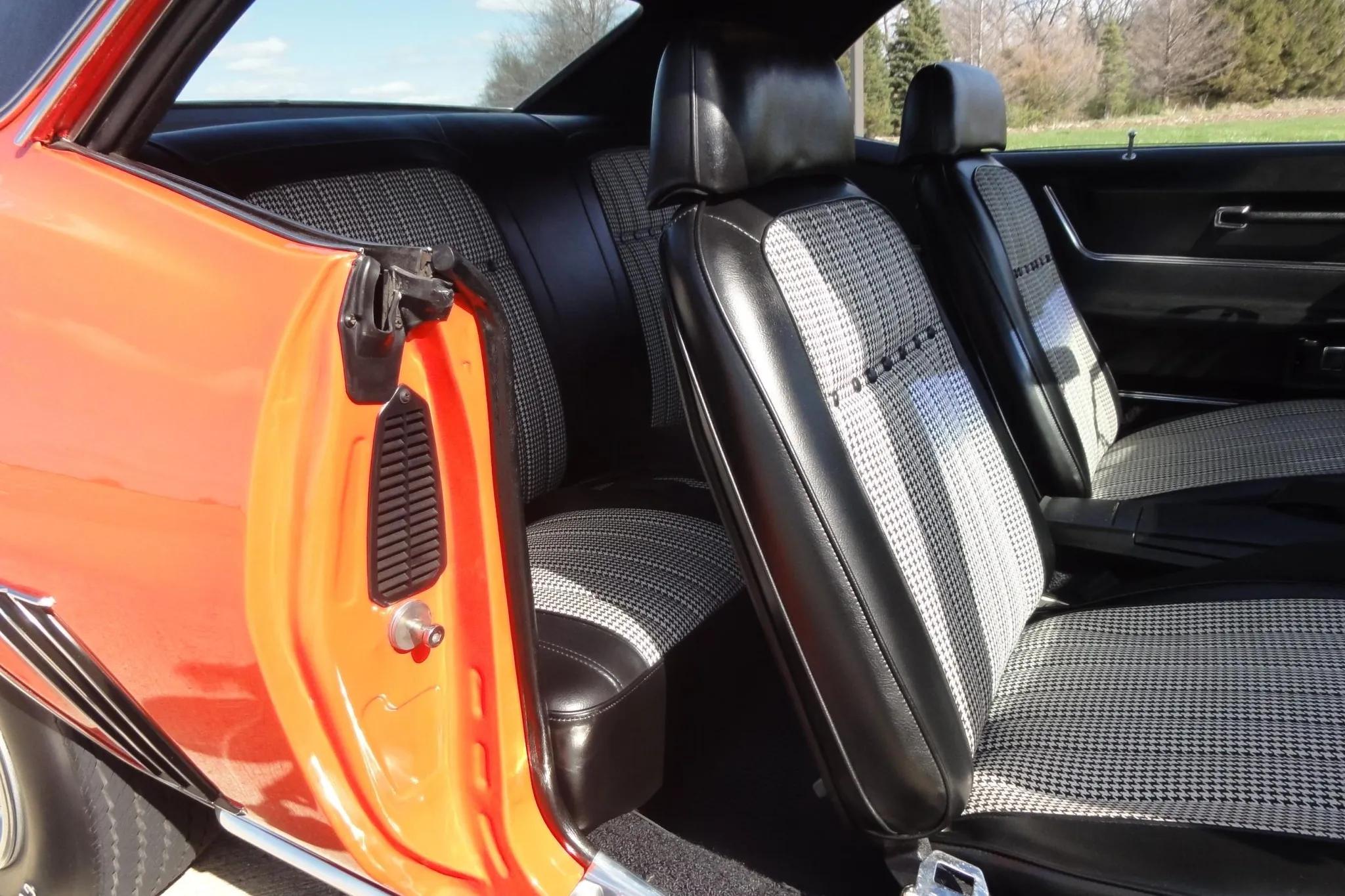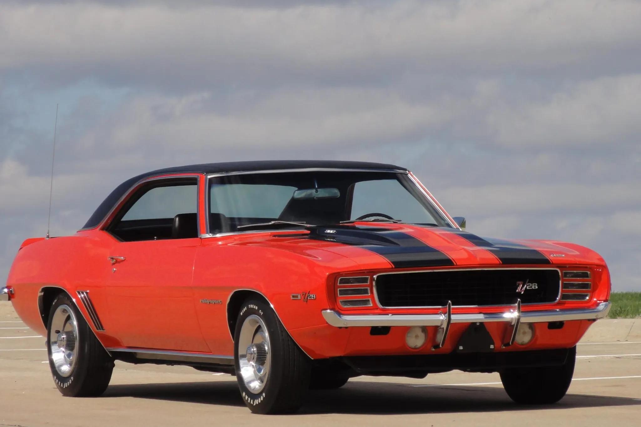 This 1969 Chevrolet Camaro Z/28 coupe was first delivered to Boggess Chevrolet in Madisonville, Kentucky, and was refurbished in 2008. The work included refinishing the body in Hugger Orange with black stripes and a black vinyl roof, along with re-trimming the interior in black and ivory houndstooth upholstery. Power is provided by a 302ci V8 paired with a four-speed manual transmission and a Positraction differential. Features include a cowl induction hood, an RS-style grille with concealed headlamps, 15" Rally wheels, a dual exhaust system, a center console, an AM/FM radio, and power-assisted front disc brakes.