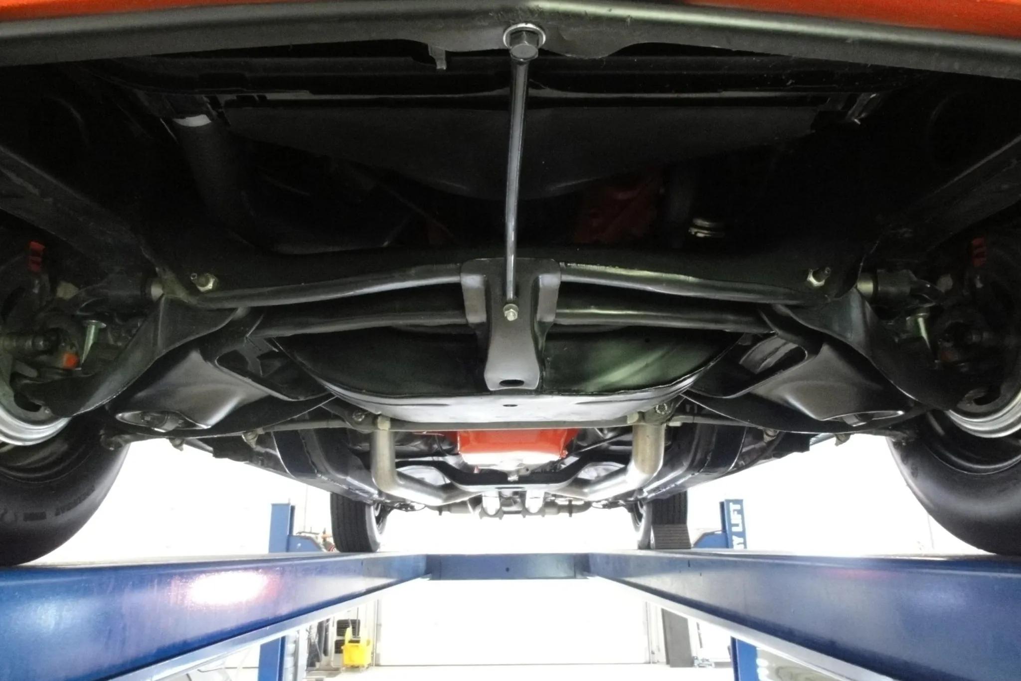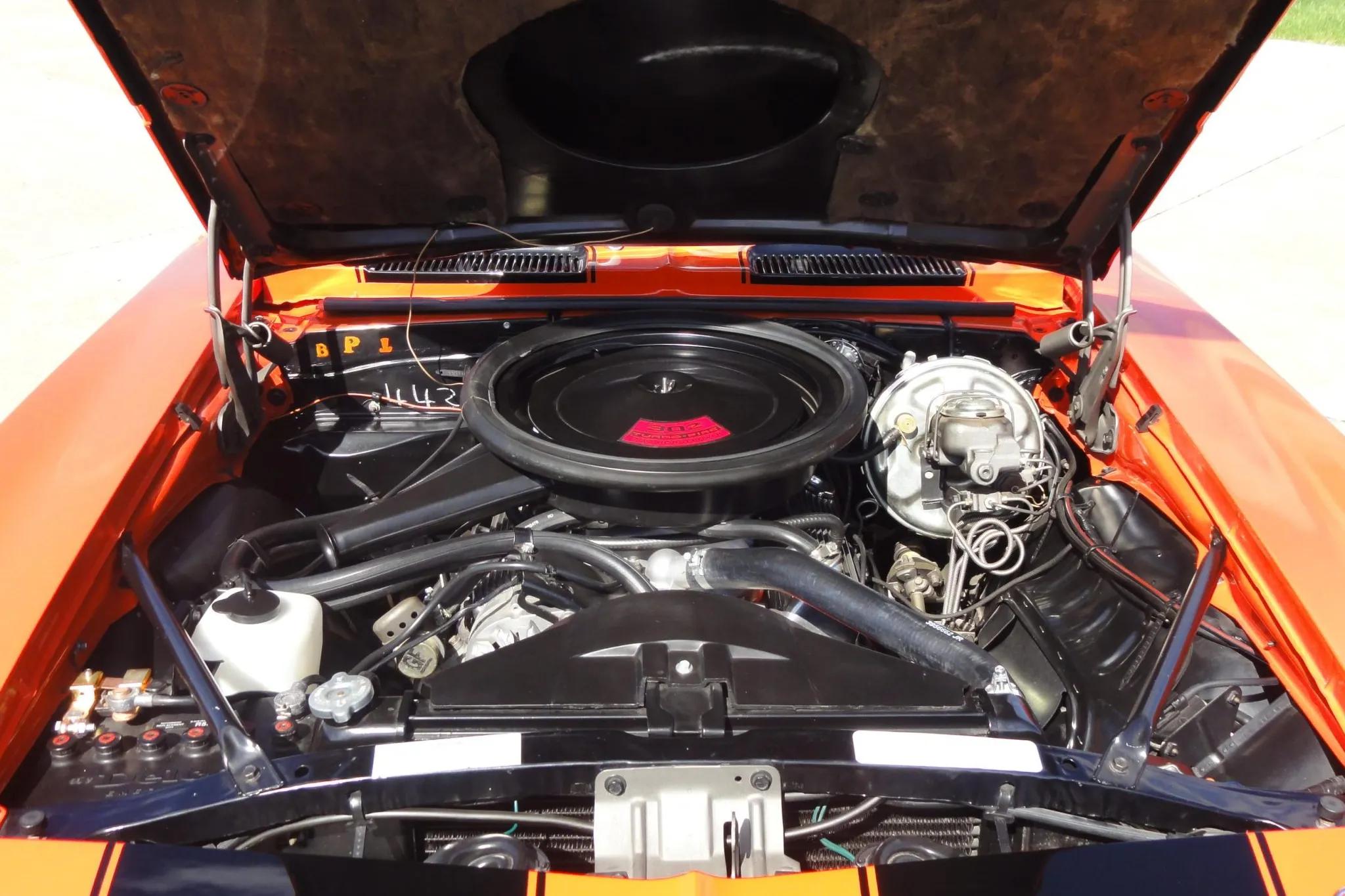The body is finished in Hugger Orange with a black vinyl roof and black stripes. Exterior details include front and rear spoilers, an RS-style grille with retractable headlight covers, and chrome bumpers with front and rear bumper guards. The 15" Rally wheels are fitted with reproduction E70-15 Goodyear Wide Tread GT tires. Braking is handled by power-assisted front discs and rear drums.