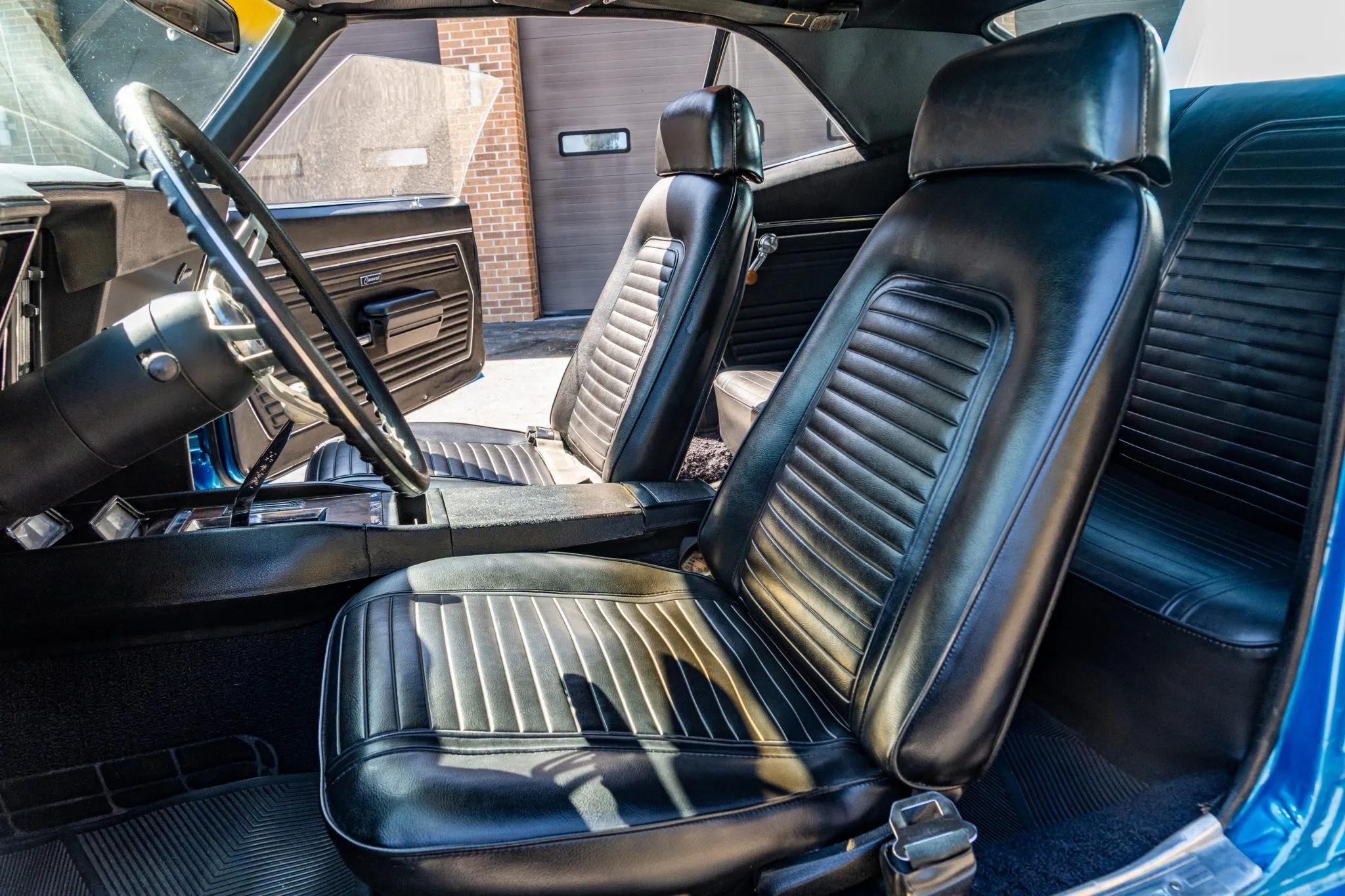 This 1969 Chevrolet Camaro Z/28 coupe was refinished in LeMans Blue with white stripes and is powered by a 302ci V8 paired with a four-speed manual transmission and a limited-slip differential. Equipment includes power steering, power-assisted front disc brakes, front and rear spoilers, 15" Rally wheels, and a dual exhaust system.