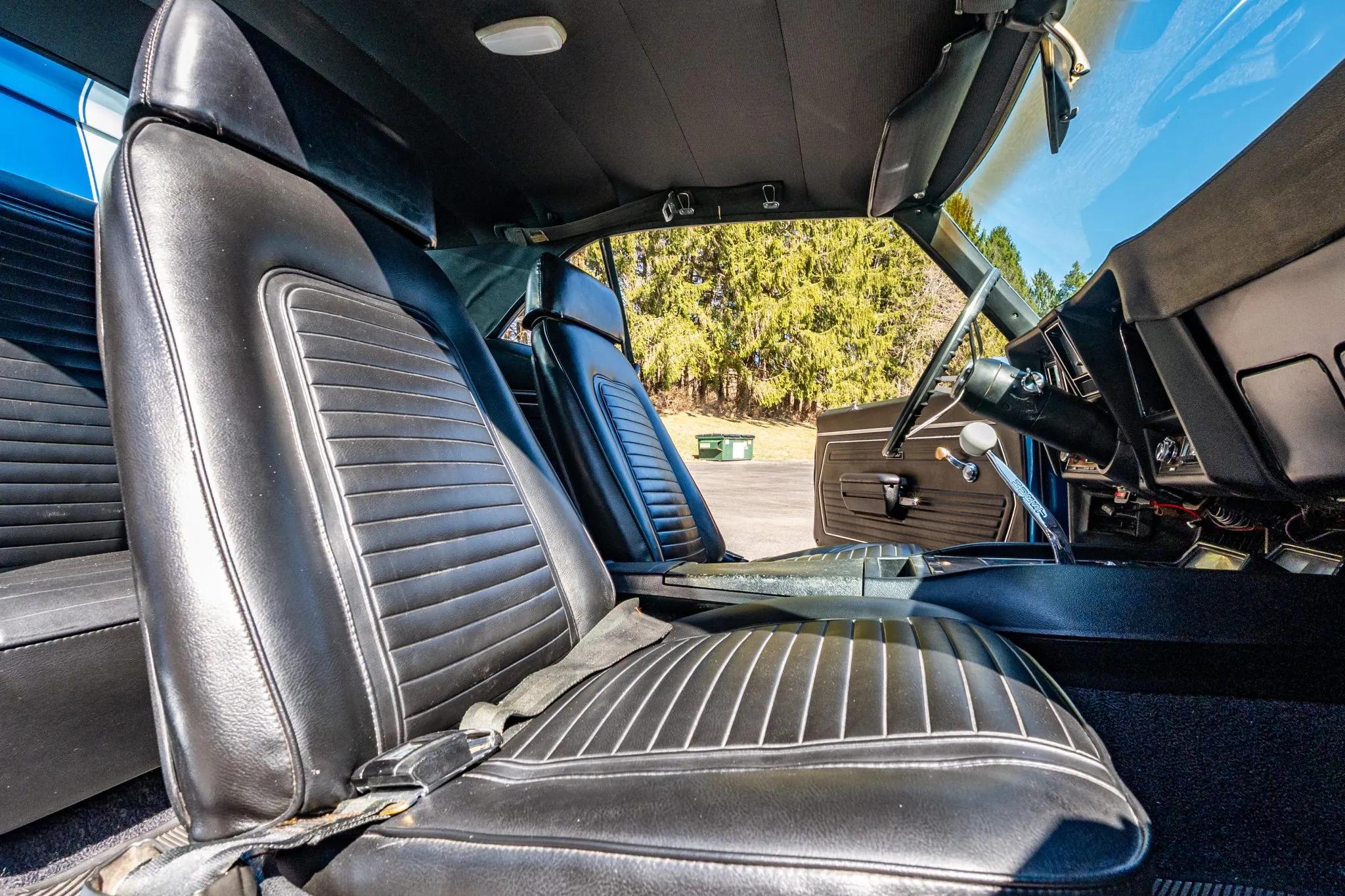 The body is finished in LeMans Blue with white stripes and features dual side mirrors, front and rear spoilers, and chrome bumpers with rear guards. The 15" Rally wheels are fitted with reproduction Firestone Wide Oval white-letter tires.