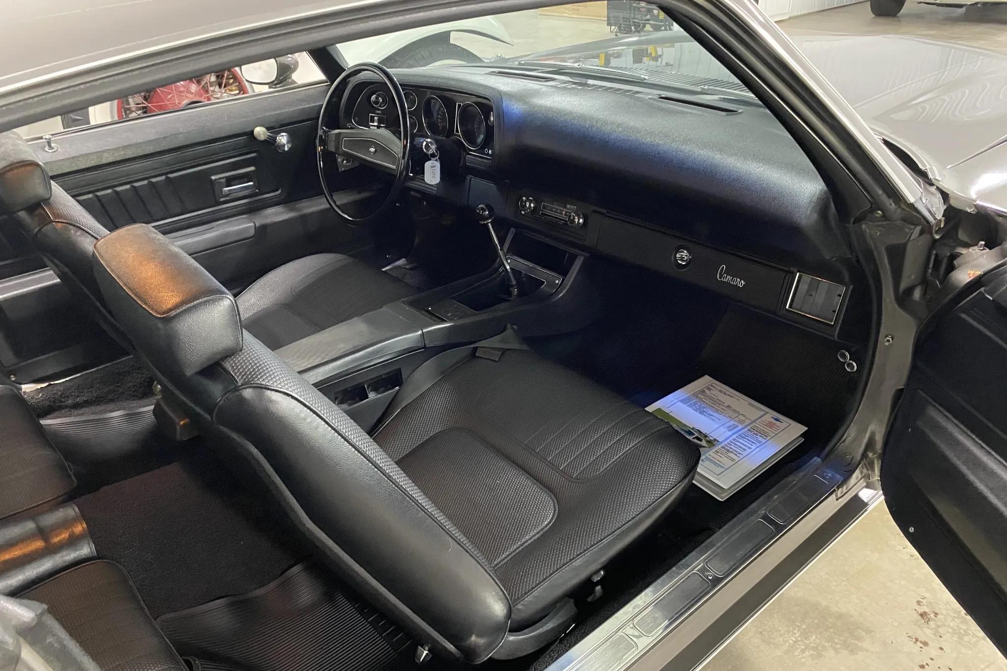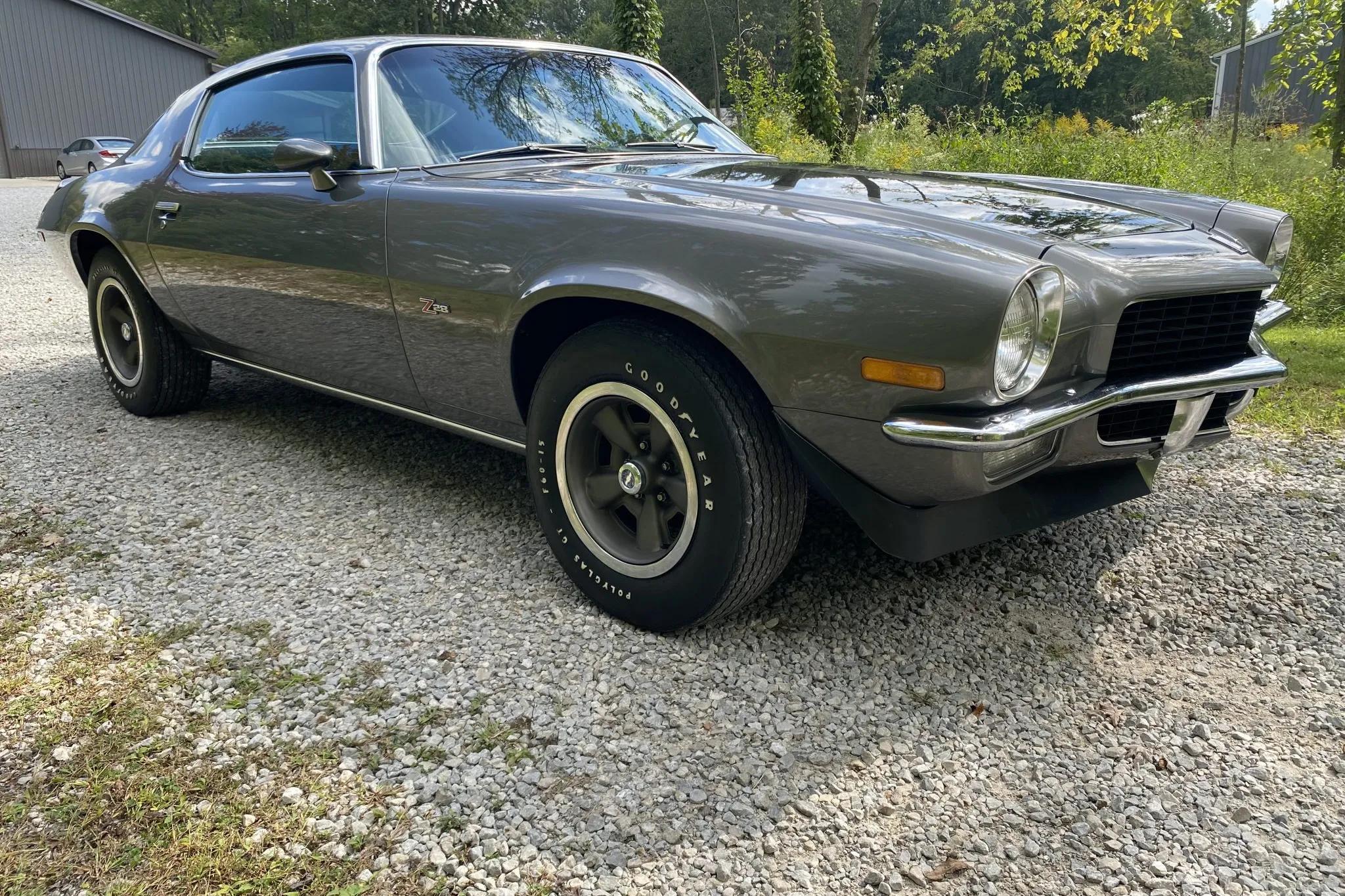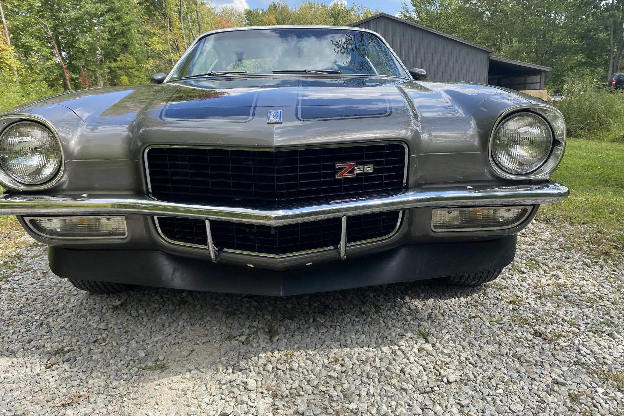 This 1970 Chevrolet Camaro Z28 is finished in Shadow Gray with black stripes over black vinyl upholstery and is powered by a 350ci LT1 V8 paired with a Muncie four-speed manual transmission and a Positraction rear differential. Equipment includes front and rear spoilers, sport mirrors, 15" alloy wheels, an AM/FM stereo, and power-assisted front disc brakes.