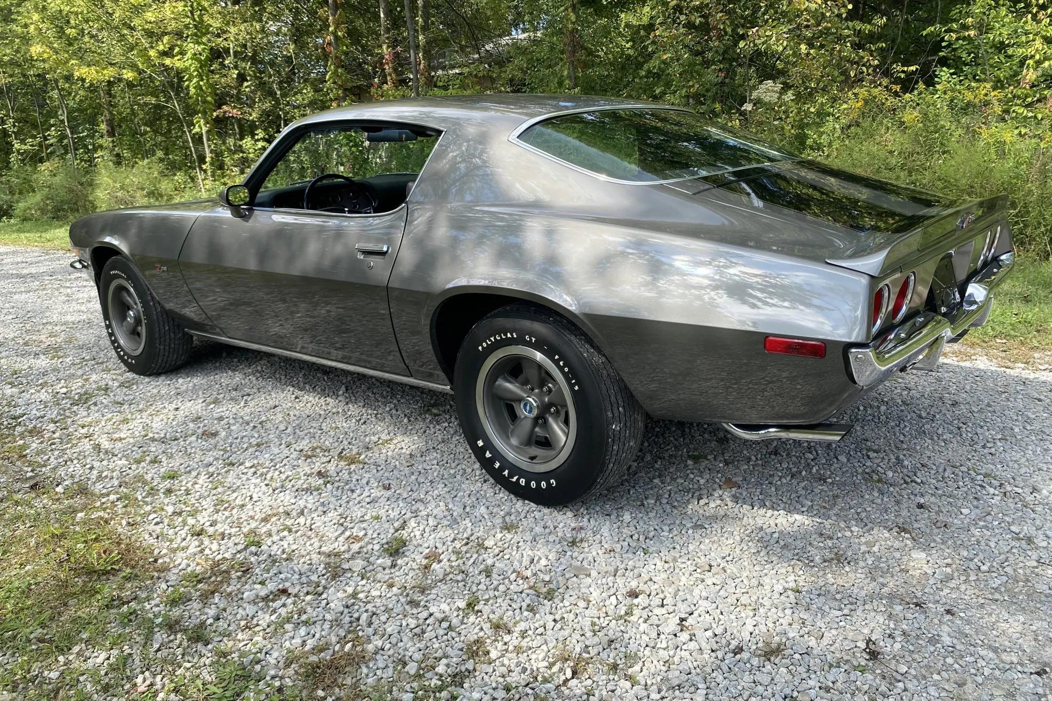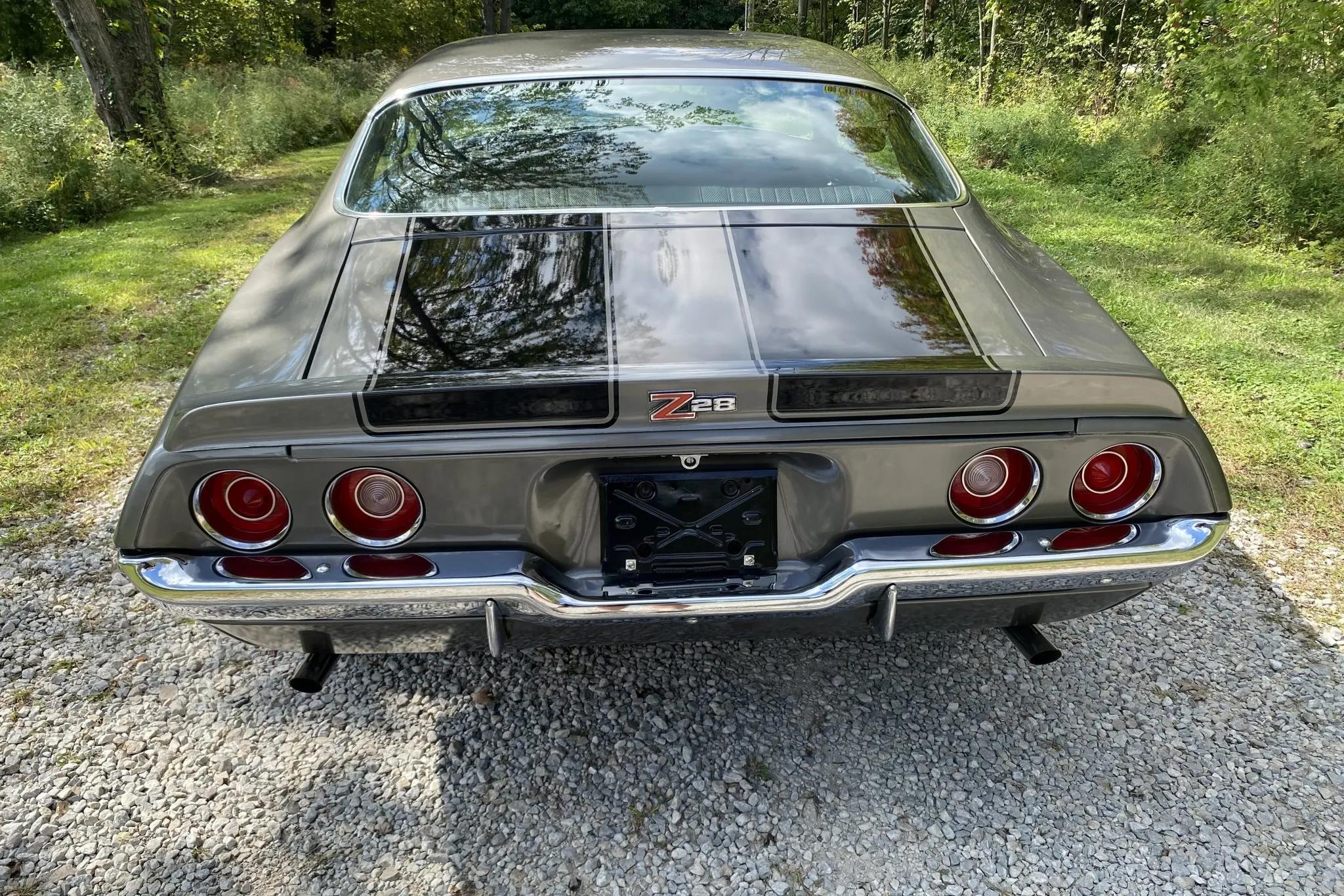 The exterior features Shadow Gray paint with black stripes, chrome bumpers and trim, dual exhaust outlets, and Z28 badging. The car rides on five-spoke 15" alloy wheels with polished beauty rings and Goodyear Polyglas GT tires. Braking is handled by power-assisted front discs and rear drums, and a spare wheel with a jack is housed in the trunk.