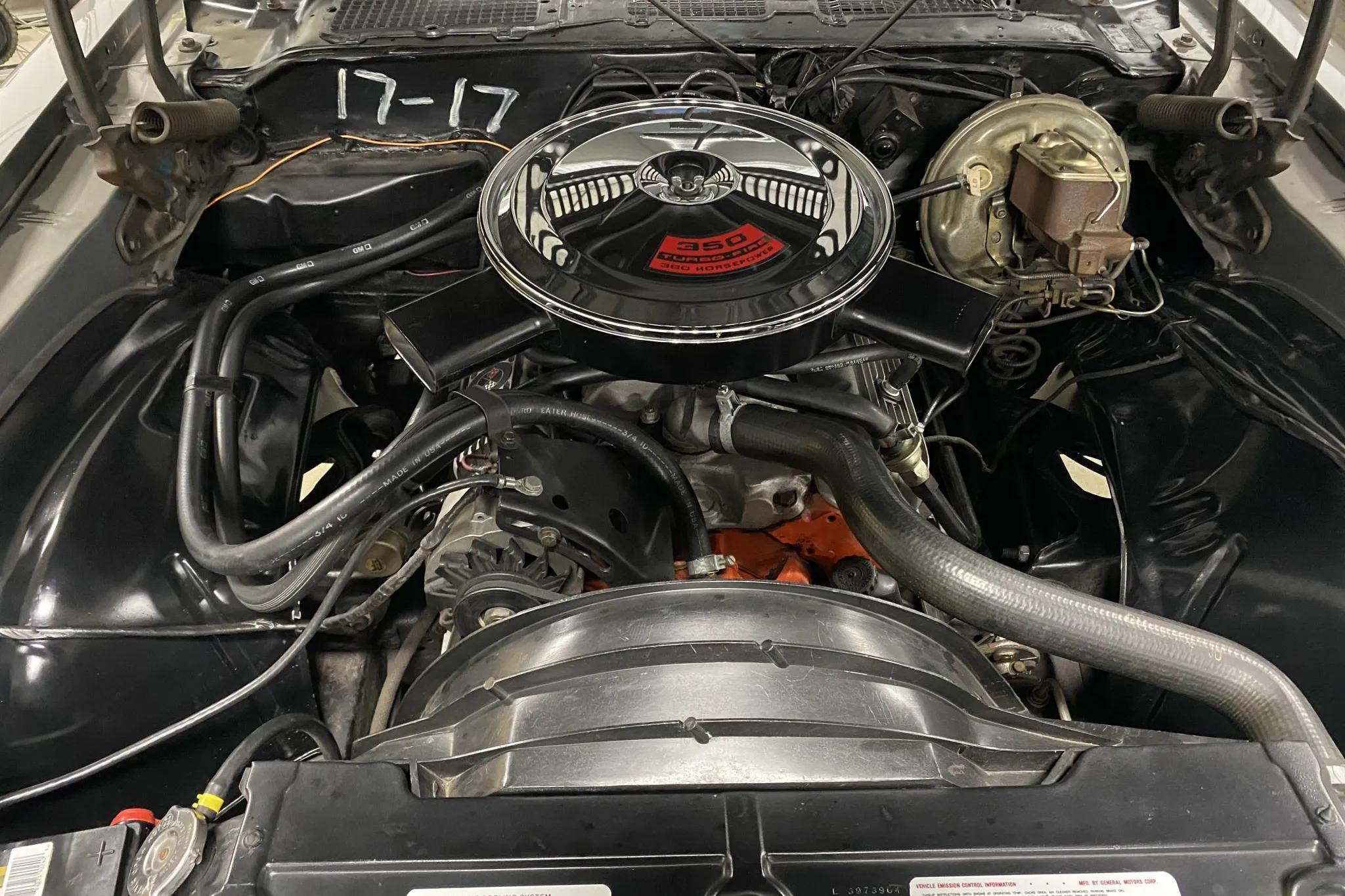 The 350ci LT1 V8 was factory rated at 350 horsepower and 380 lb-ft of torque. Power is delivered to the rear wheels through a Muncie four-speed manual transmission and a Positraction differential.