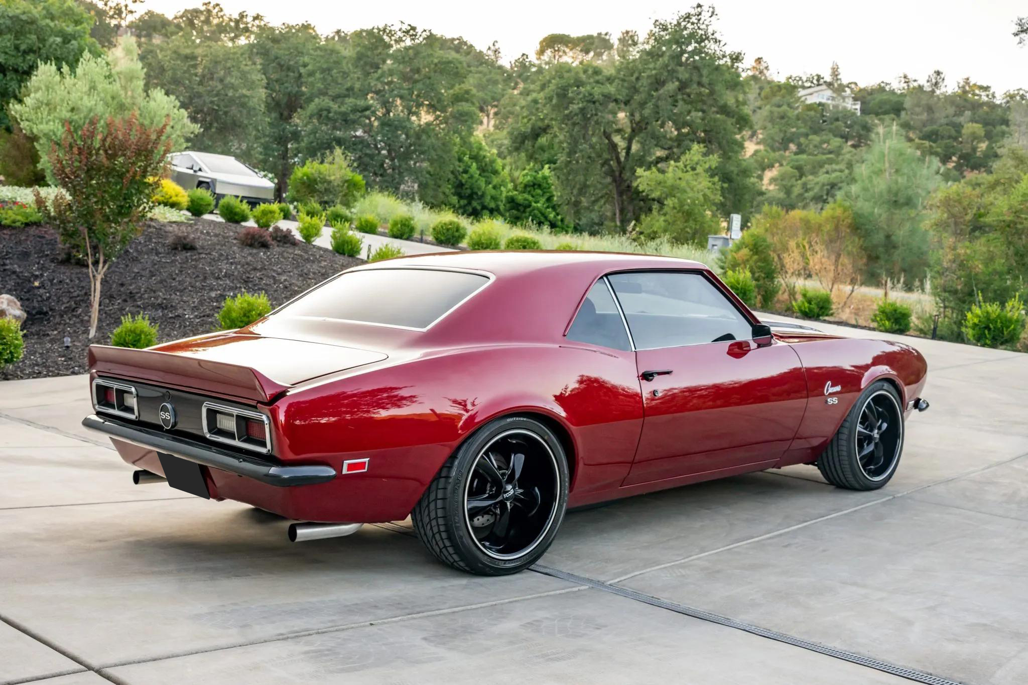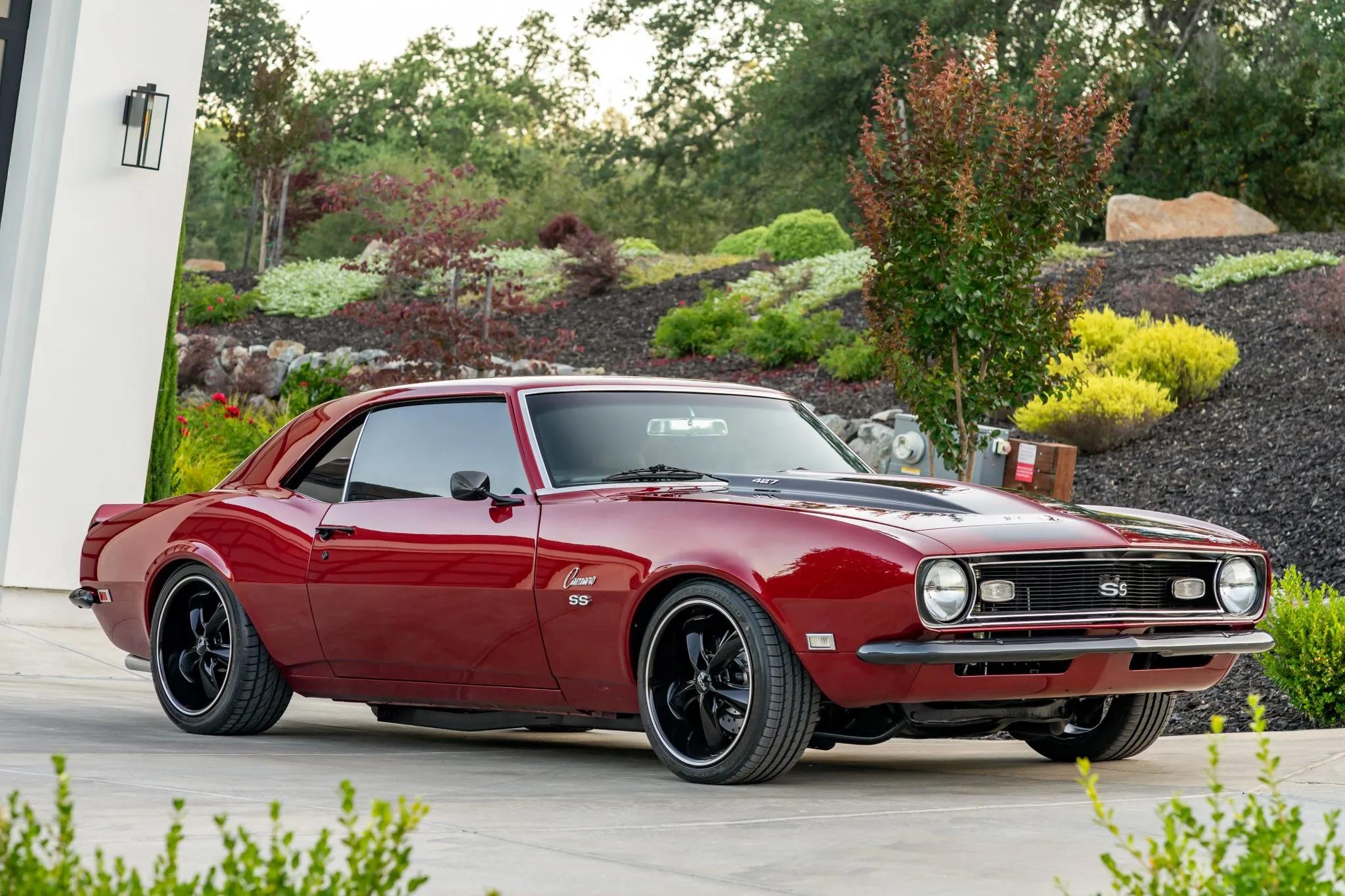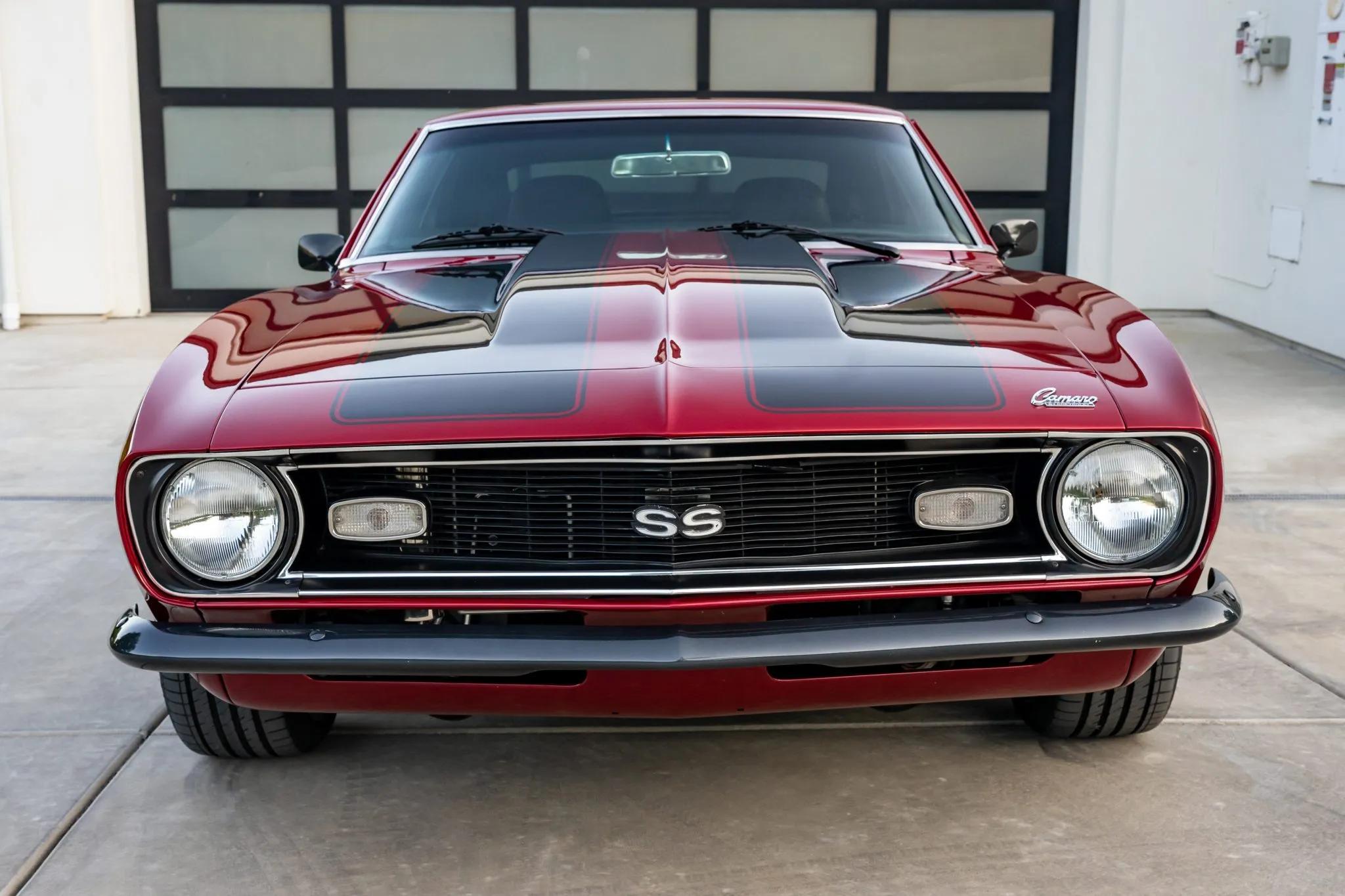 This 1968 Chevrolet Camaro coupe was refurbished and modified with a fuel-injected 427ci small-block stroker V8, an automatic transmission, and a repaint in Red Jewel Metallic with black hood stripes. The build also included overhauls to the cabin, suspension, and brakes.