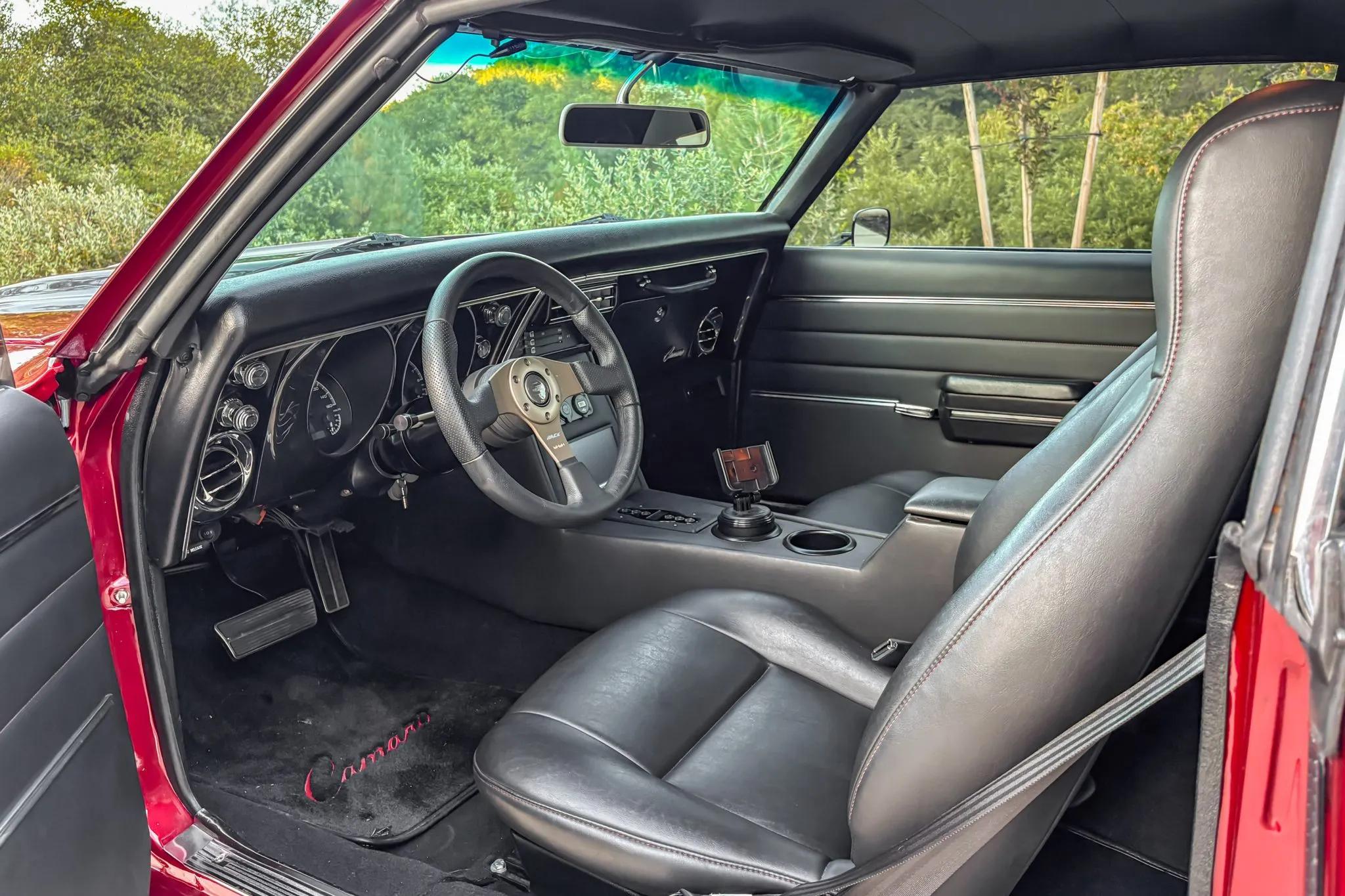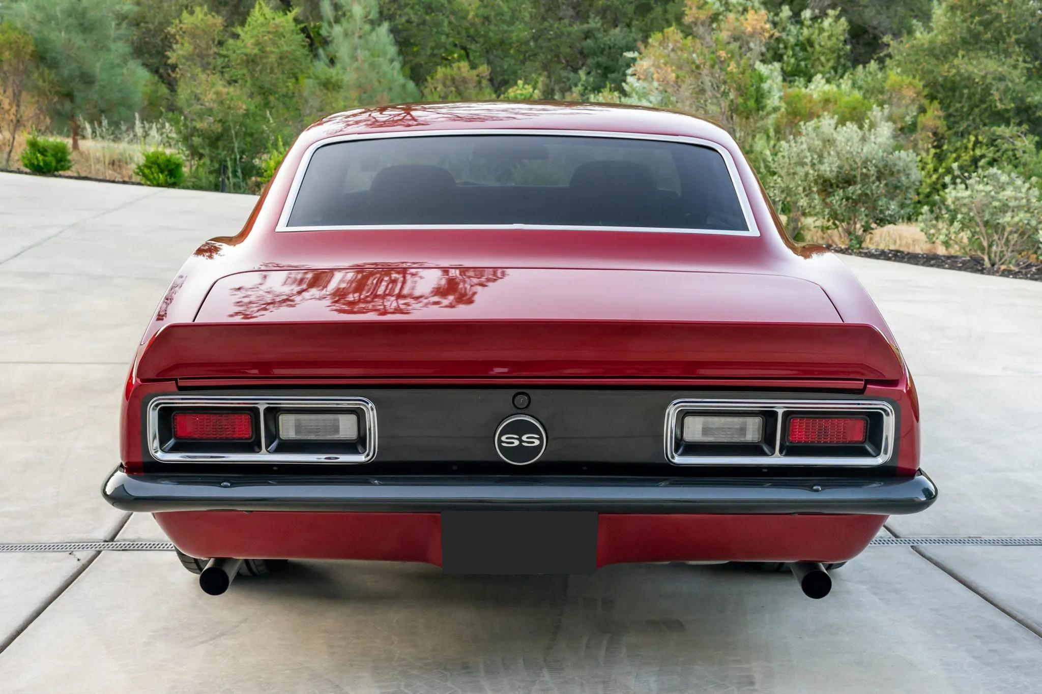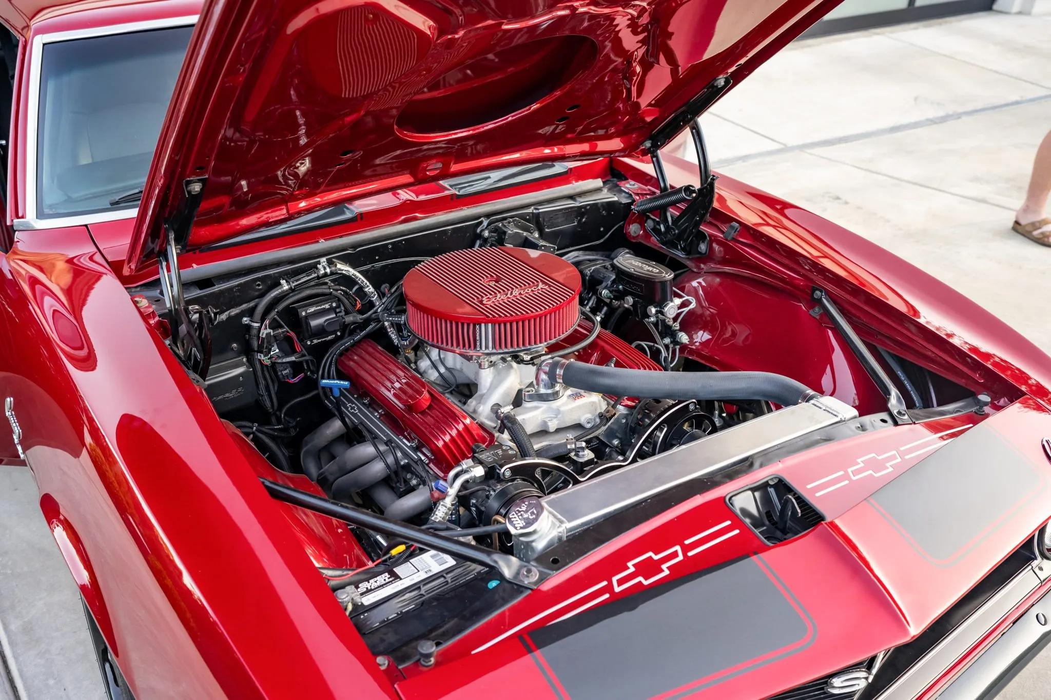 This 1968 Chevrolet Camaro coupe was refurbished and modified with a fuel-injected 427ci small-block stroker V8, an automatic transmission, and a repaint in Red Jewel Metallic with black hood stripes. The build also included overhauls to the cabin, suspension, and brakes.
