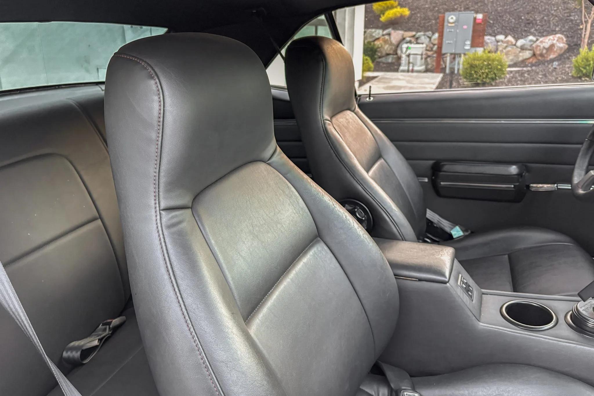 The interior features aftermarket front bucket seats and a rear bench upholstered in black vinyl, a center console, Sony infotainment system with back-up camera, Pioneer stereo receiver, Rockford Fosgate audio, push-button transmission controls, power windows and locks, air conditioning, and a Ravelco anti-theft device. A Momo steering wheel fronts Dakota Digital instrumentation.