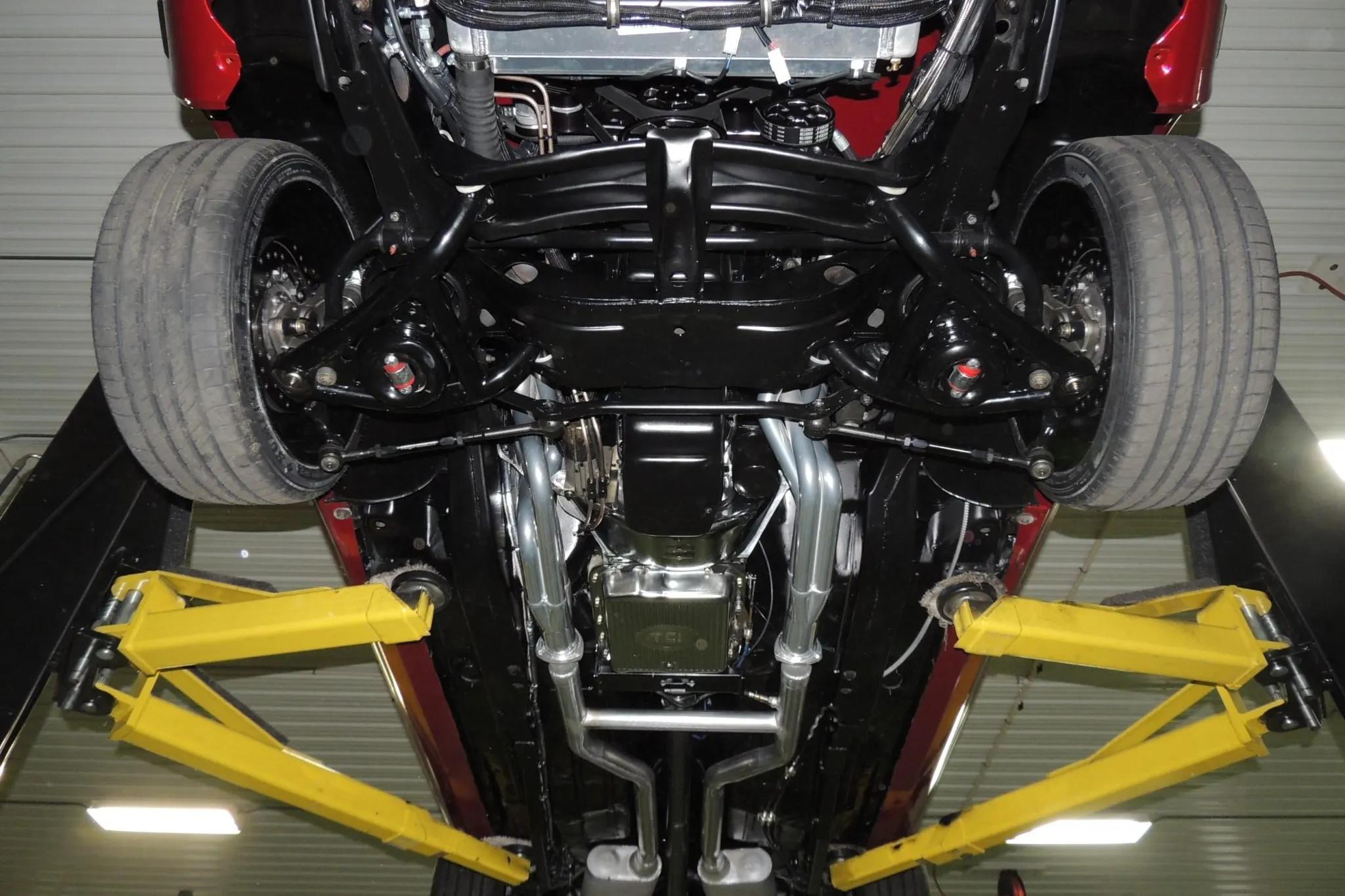 Equipment includes a Positraction differential, Wilwood power-assisted four-wheel disc brakes, power steering, 18" Foose wheels, tubular front control arms, adjustable front coilovers, and a cowl-induction hood.