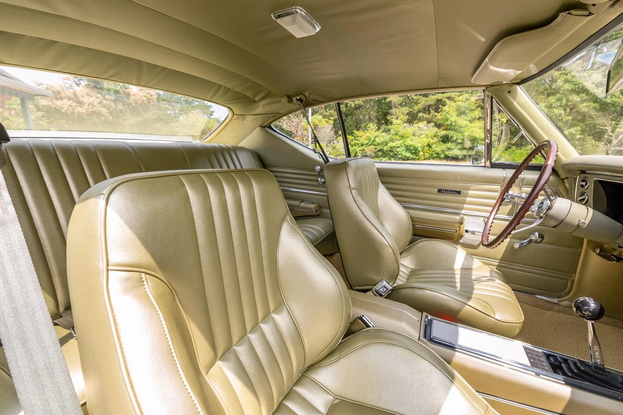 The exterior is finished in Ivory Gold with replacement glass, chrome, and bumpers. Features include a refinished cowl panel, radiator support, fenders, quarter panels, doors, and realigned badging. The car rides on five-spoke 18" E-T wheels with 245/45 front and 315/40 rear Nitto NT555 G2 tires.