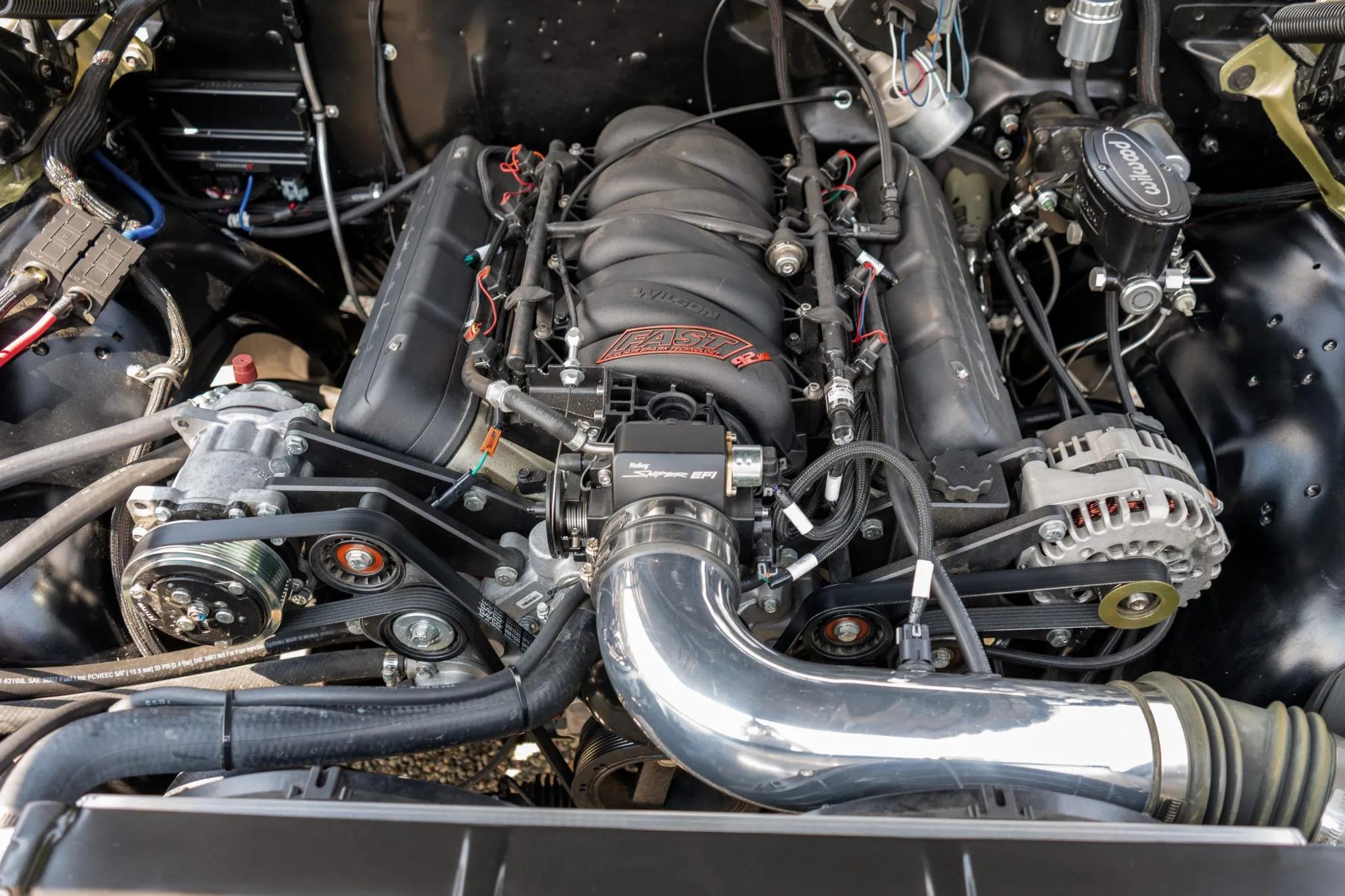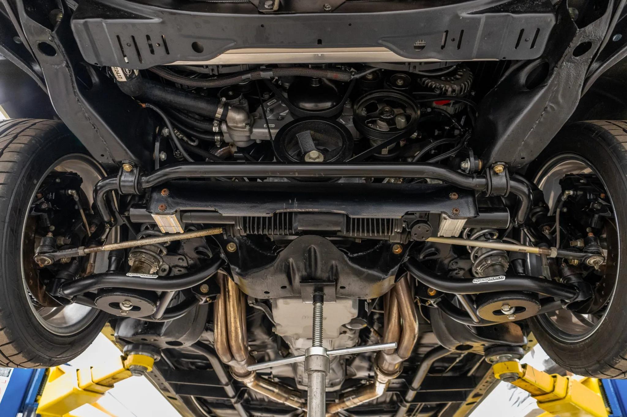 Power is sent to the rear wheels through the six-speed manual transmission with an American Powertrain hydraulic clutch and the Ford 9" rear end with Detroit Truetrac differential. A revised driveshaft and U-joints complete the drivetrain.