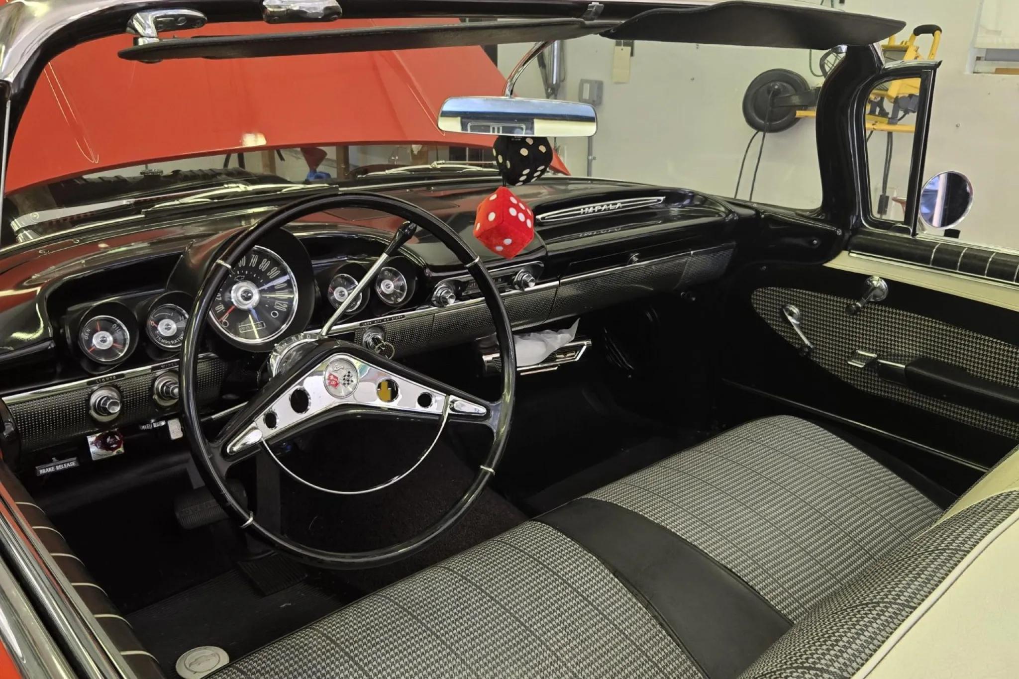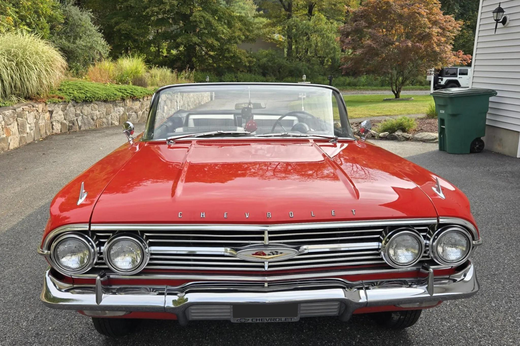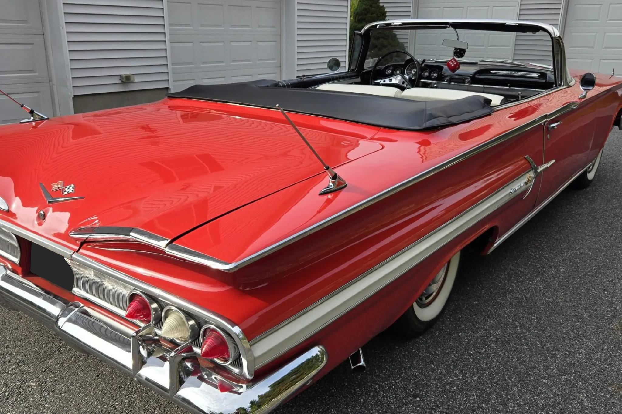 This 1960 Chevrolet Impala convertible is powered by a 348ci V8 with three two-barrel carburetors paired with a two-speed Powerglide automatic transmission. The body is finished in Roman Red with a power-operated white soft top and black vinyl boot cover. Exterior details include horizontal tail fins, dual antennas, crossed-flag wheel covers, whitewall tires, and chrome bumpers.