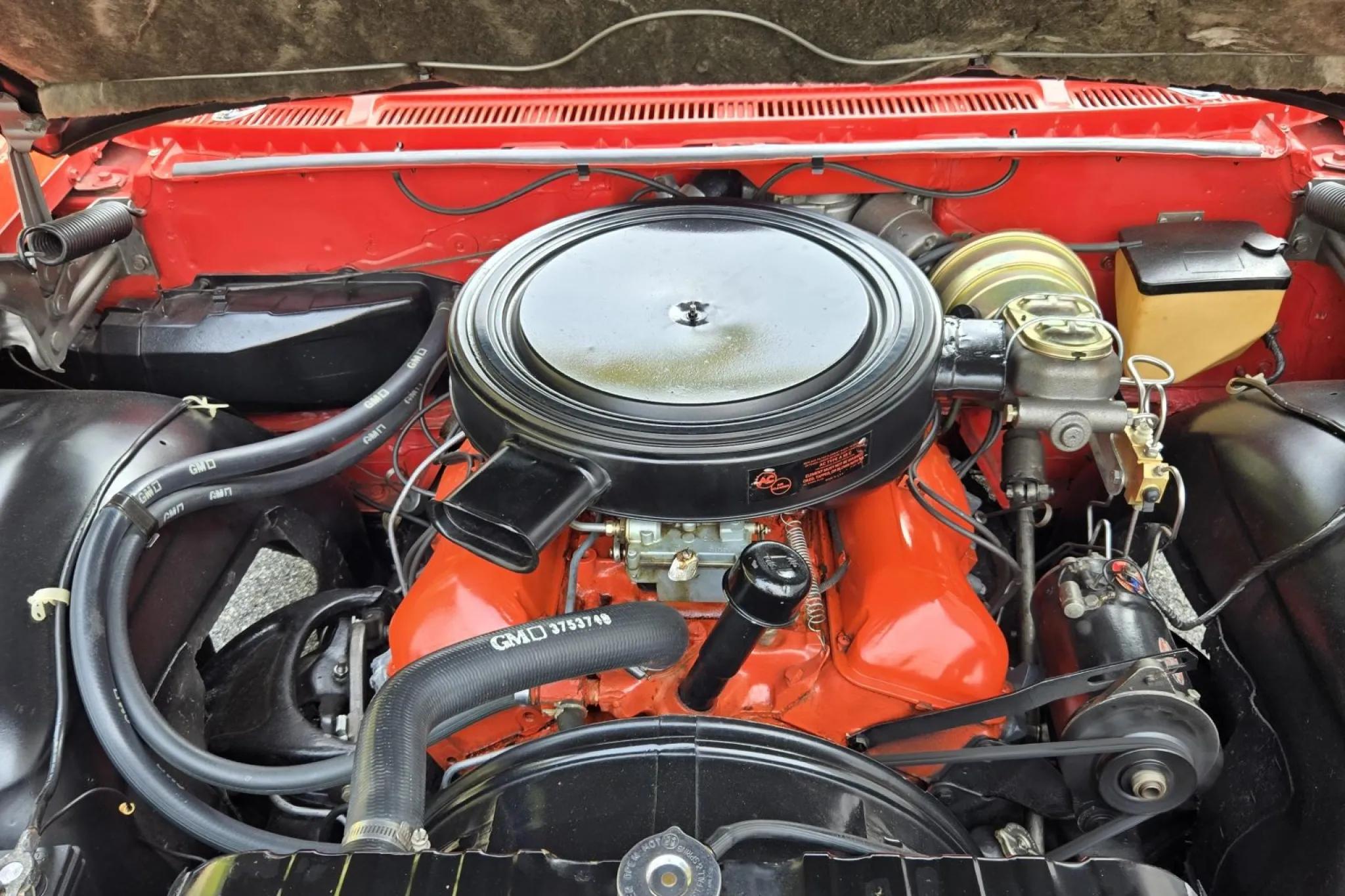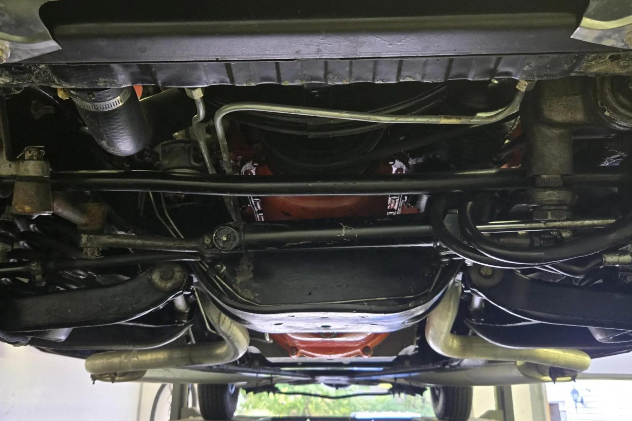 The car rides on red-finished 14" steel wheels with crossed-flag covers and Coker Classic whitewall tires. Power steering and drum brakes are equipped.