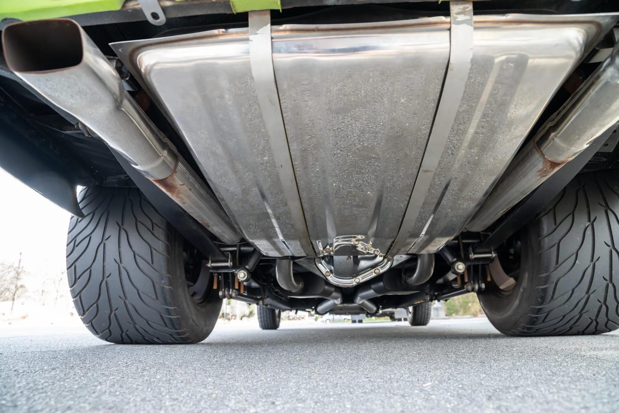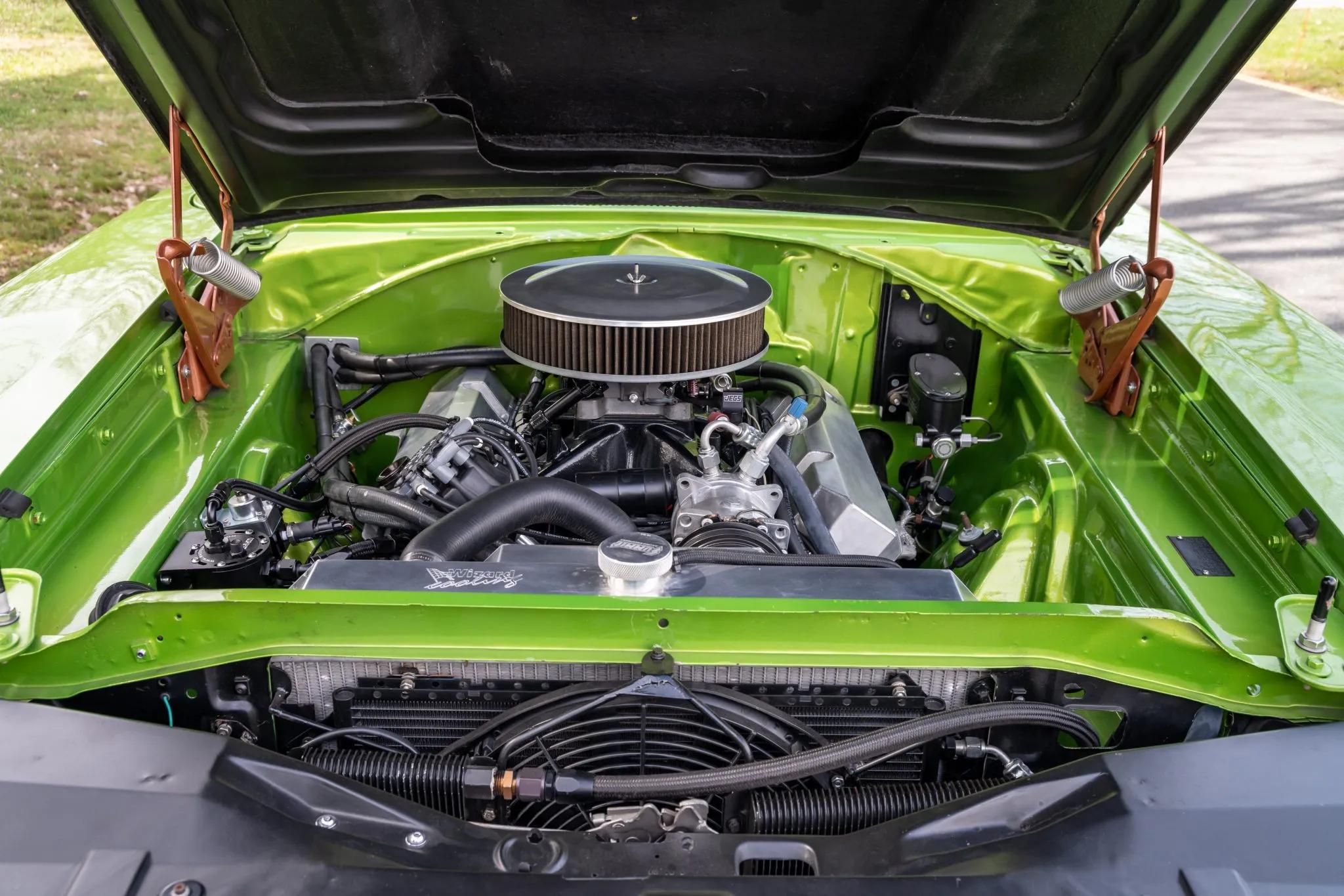 The car is finished in Dodge Viper Snakeskin Green with black R/T stripes and a black interior. Equipment includes Procar front bucket seats, a vinyl-trimmed rear bench, lap belts, Billet Specialties 15" wheels, Wilwood four-wheel disc brakes, Firm Feel front suspension components, CalTracs rear traction bars, a 3" dual exhaust system, scooped black hood, electric headlamp doors, sequential LED taillights, and tinted glass.
