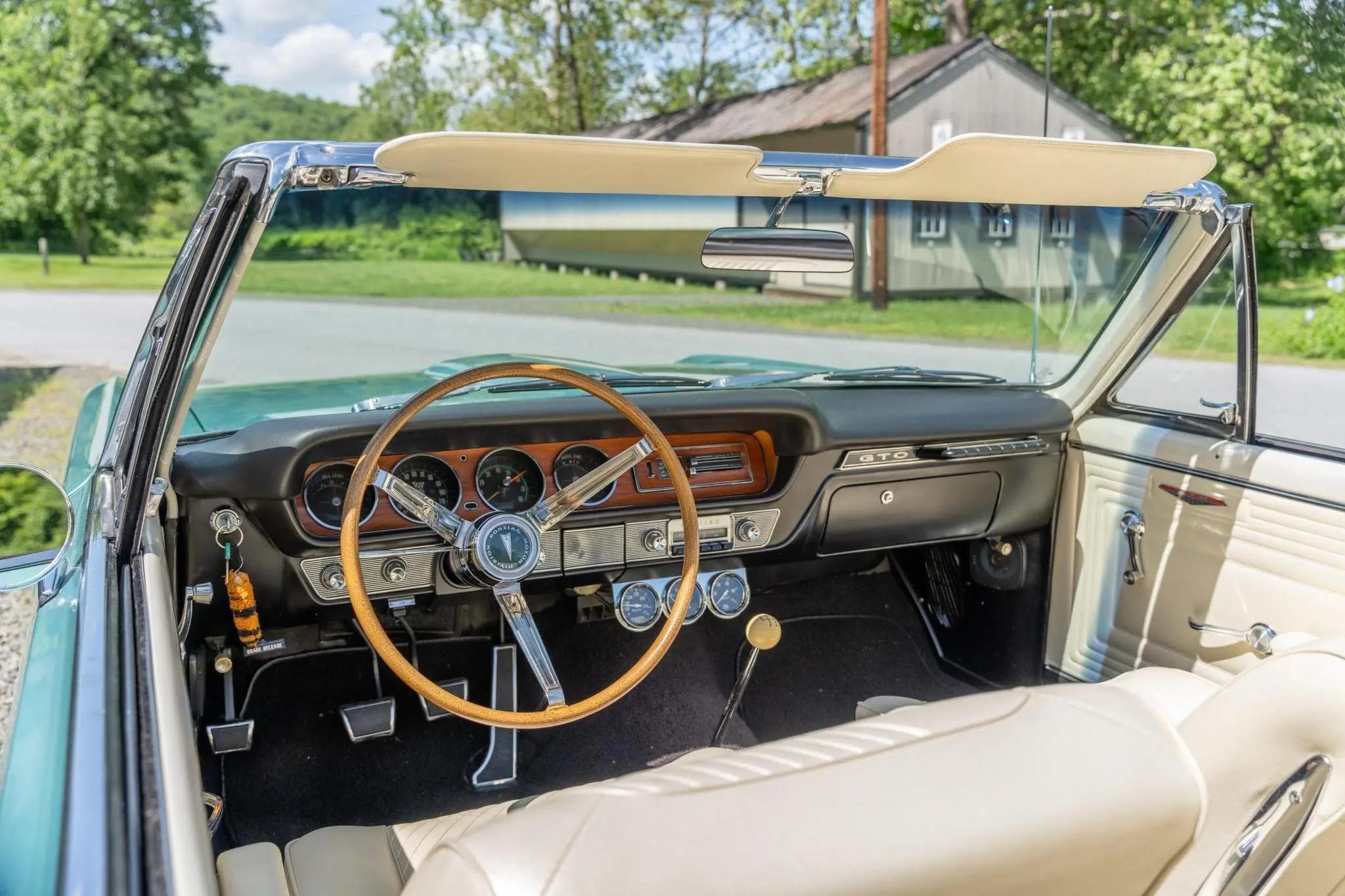 This 1965 Pontiac LeMans convertible is powered by a 389ci V8 with triple carburetors, paired with a four-speed M20 manual transmission and a 3.55:1 limited-slip differential. The car is finished in Reef Turquoise over Parchment vinyl and features a white soft top, power steering, power-assisted front disc brakes, 14" Rally wheels, and a center console.