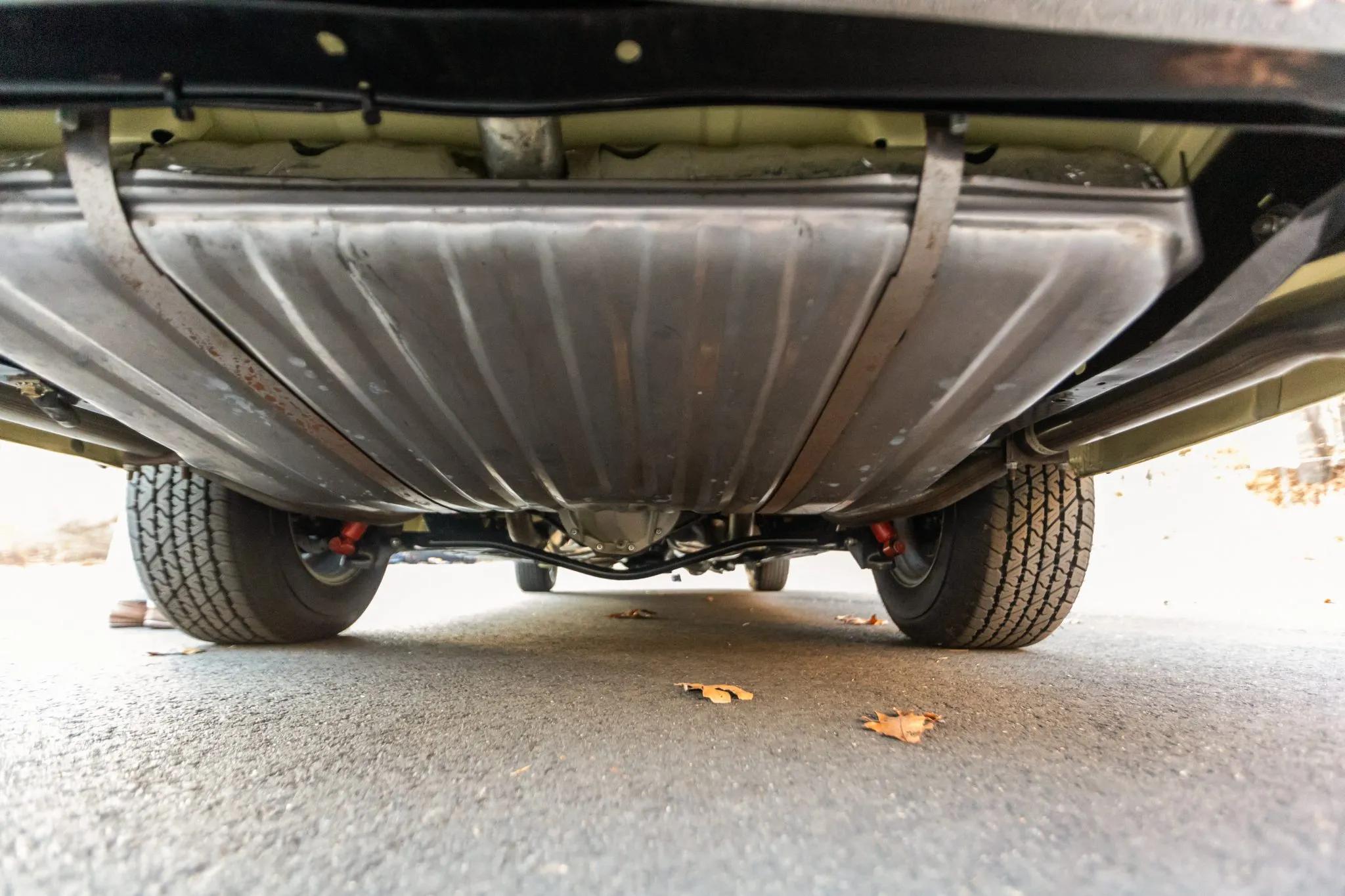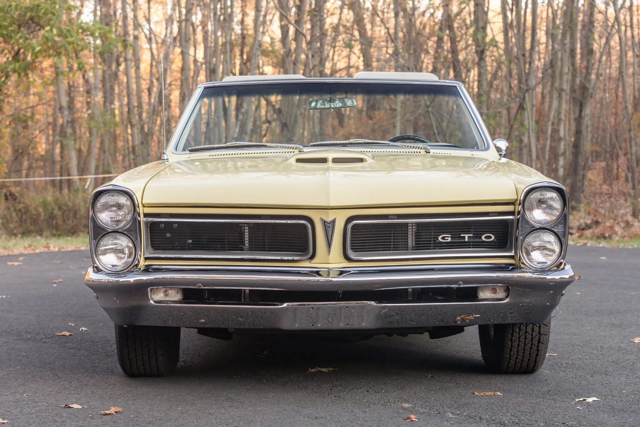 The car is finished in Mayfair Maize with a Parchment soft top, twin-scoop hood, stacked headlights, GTO badging, and chrome bumpers. It rides on 15" Rally-style wheels with redline tires and Wilwood four-wheel disc brakes. The suspension was overhauled with front and rear sway bars, lowering springs, Koni shocks, and Del-A-Lum bushings. Power steering is equipped with a Moog linkage.