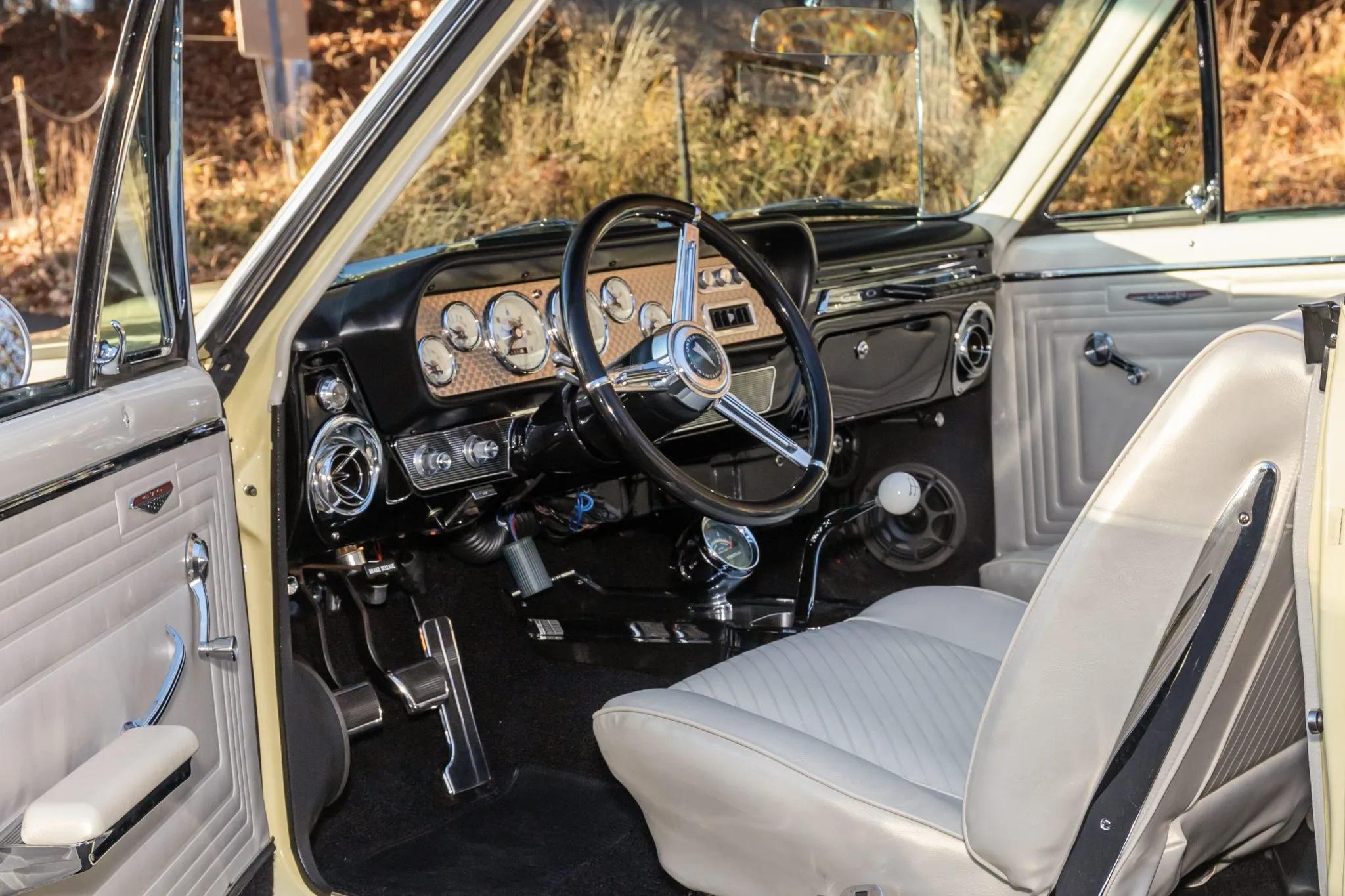 The interior features Parchment vinyl-covered front bucket and rear bench seats, engine-turned trim on the dashboard, a center console, lap belts, Vintage Air climate control, a Hurst shifter, and a digital audio system linked to aftermarket speakers. A battery box and subwoofer enclosure are fitted in the trunk. The three-spoke steering wheel fronts AutoMeter vintage-style gauges, including a 120-mph speedometer, tachometer, and fuel, voltage, coolant, and oil readouts.