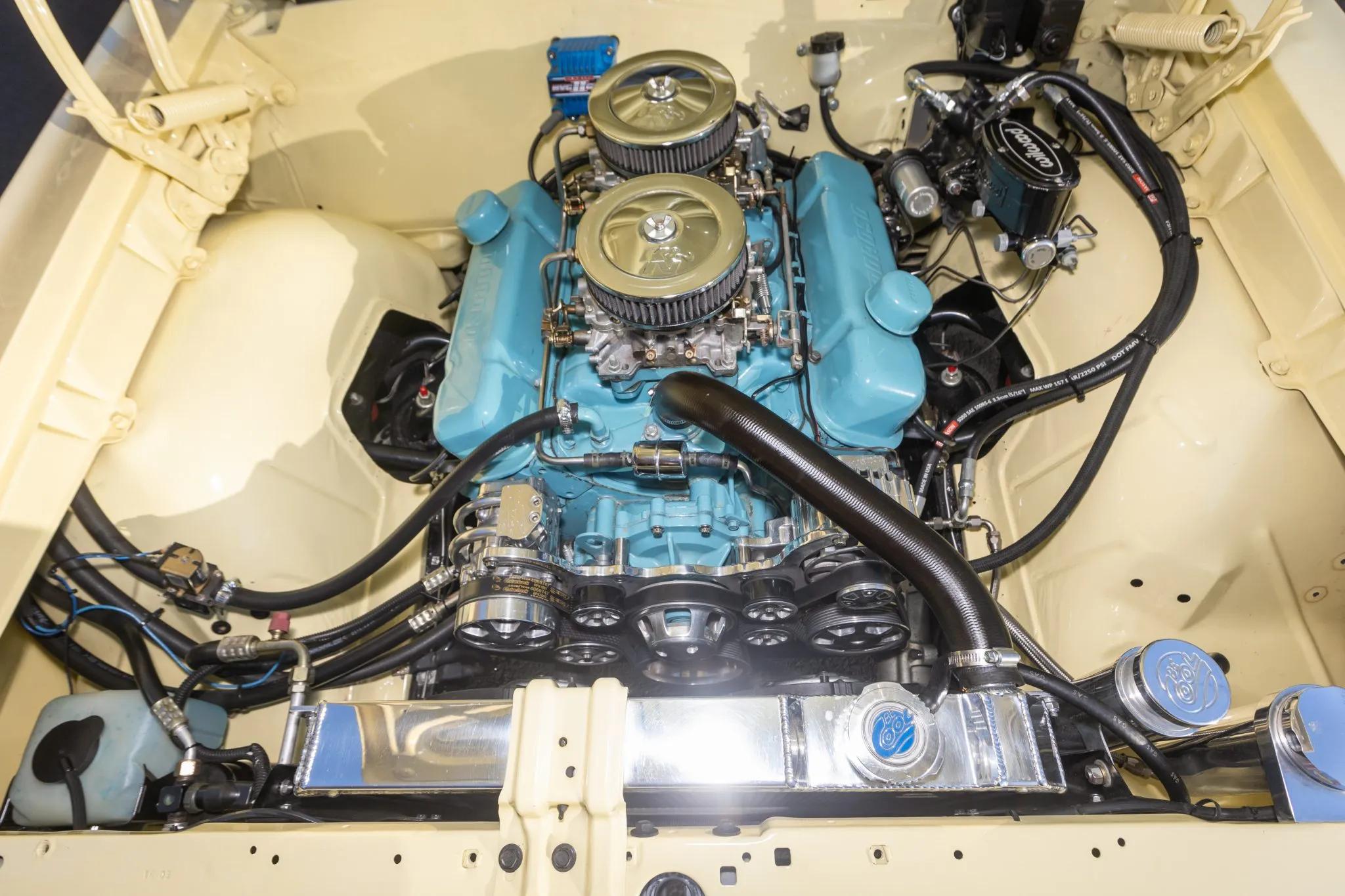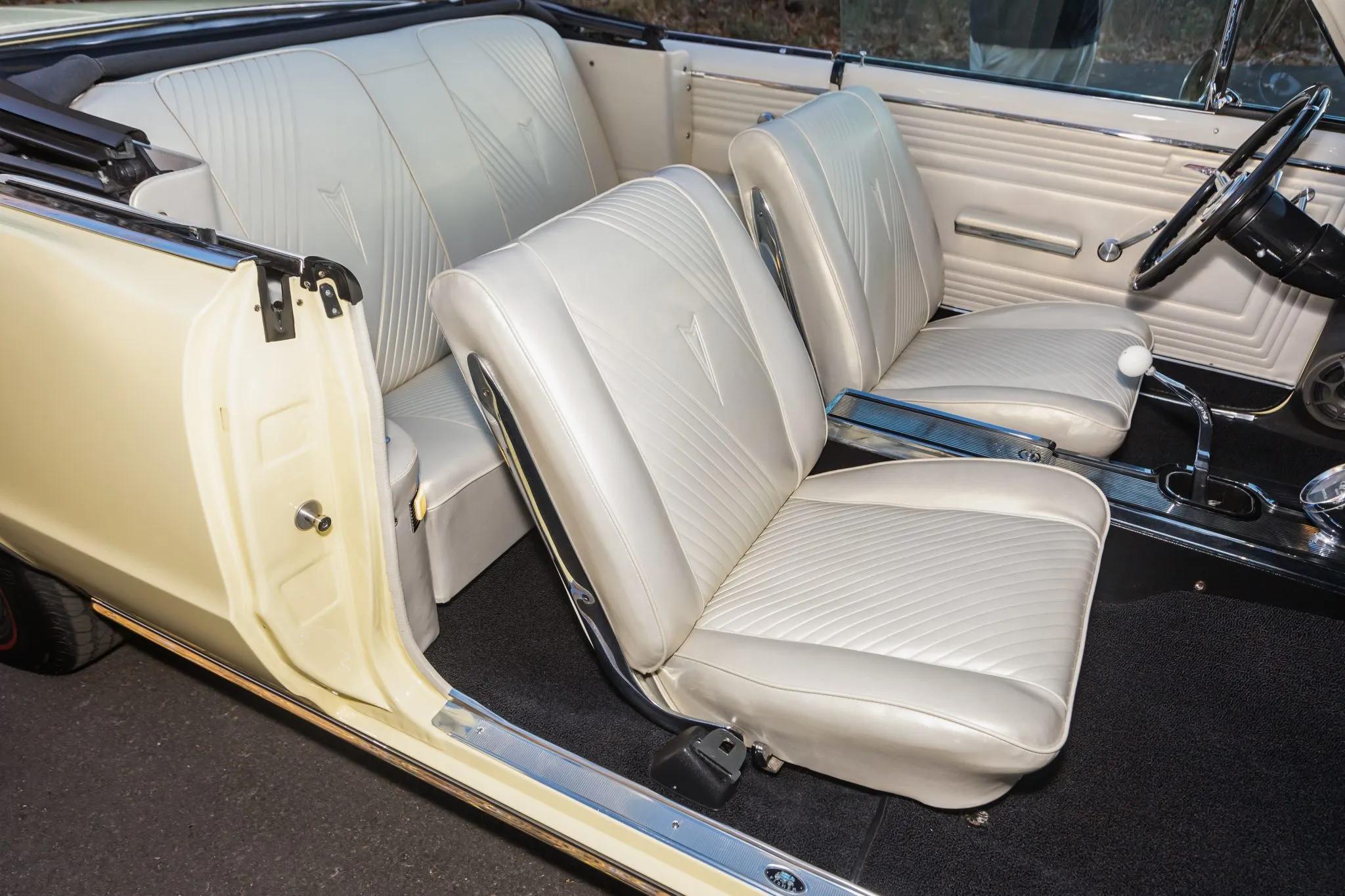 This 1965 Pontiac LeMans convertible was refurbished in 2012 in the style of a contemporary GTO. It is powered by a 455ci V8 with dual four-barrel carburetors, an Offenhauser intake manifold, and Doug's coated headers, paired with a Tremec TKO 600 five-speed manual transmission and a Moser 12-bolt rear end with an Eaton limited-slip differential.