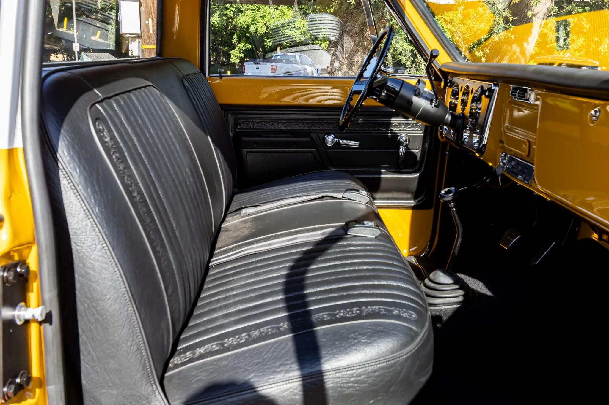 The truck is finished in Ochre and White, with the cab stripped, rust repaired, and body panels replaced as needed. The interior is retrimmed in black vinyl, with new dash pad, headliner, and carpets, and equipped with Vintage Air climate control. The bench seat was overhauled, and the two-spoke steering wheel frames a 100-mph speedometer, 5k-rpm tachometer, and auxiliary gauges.
