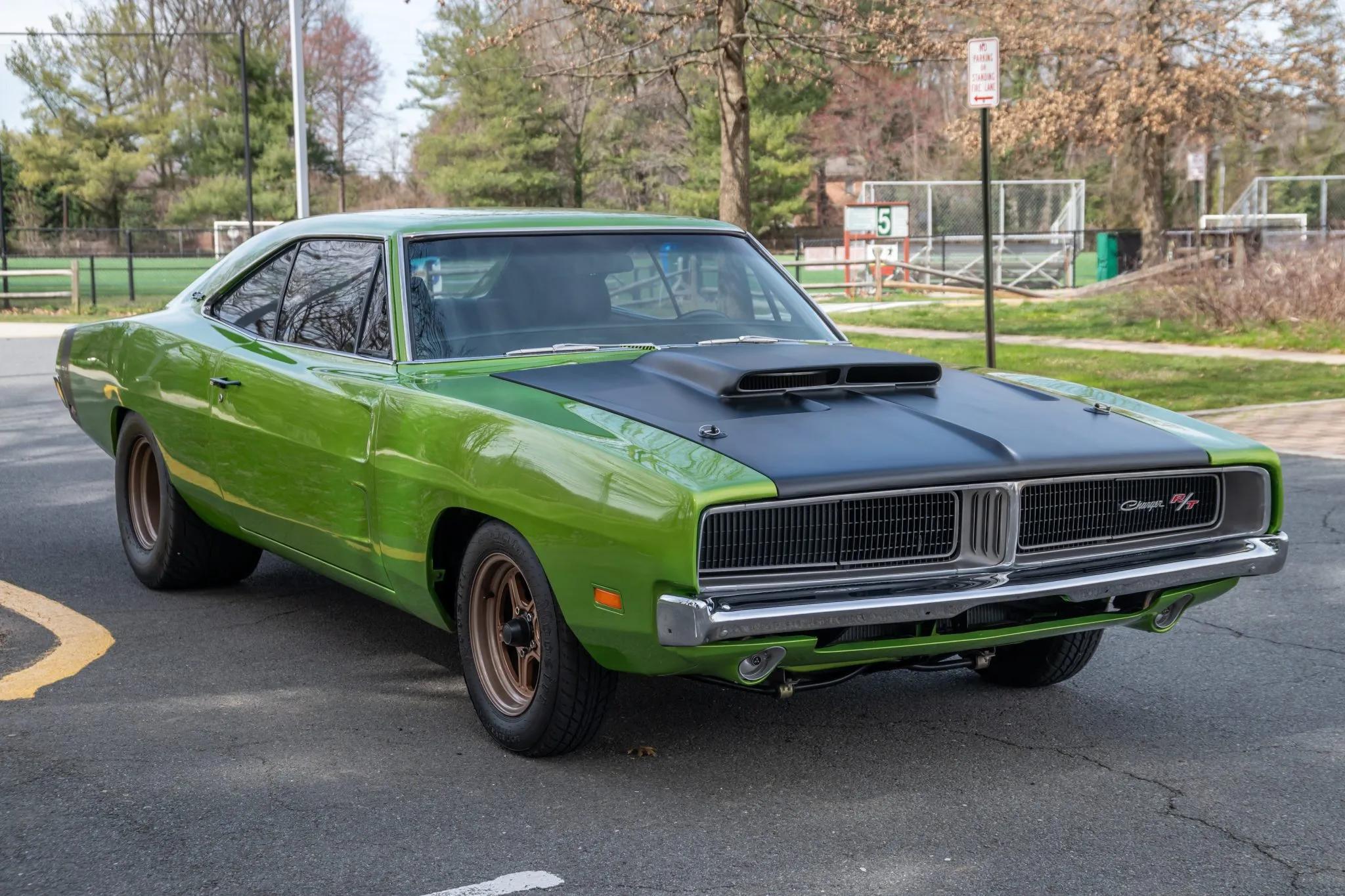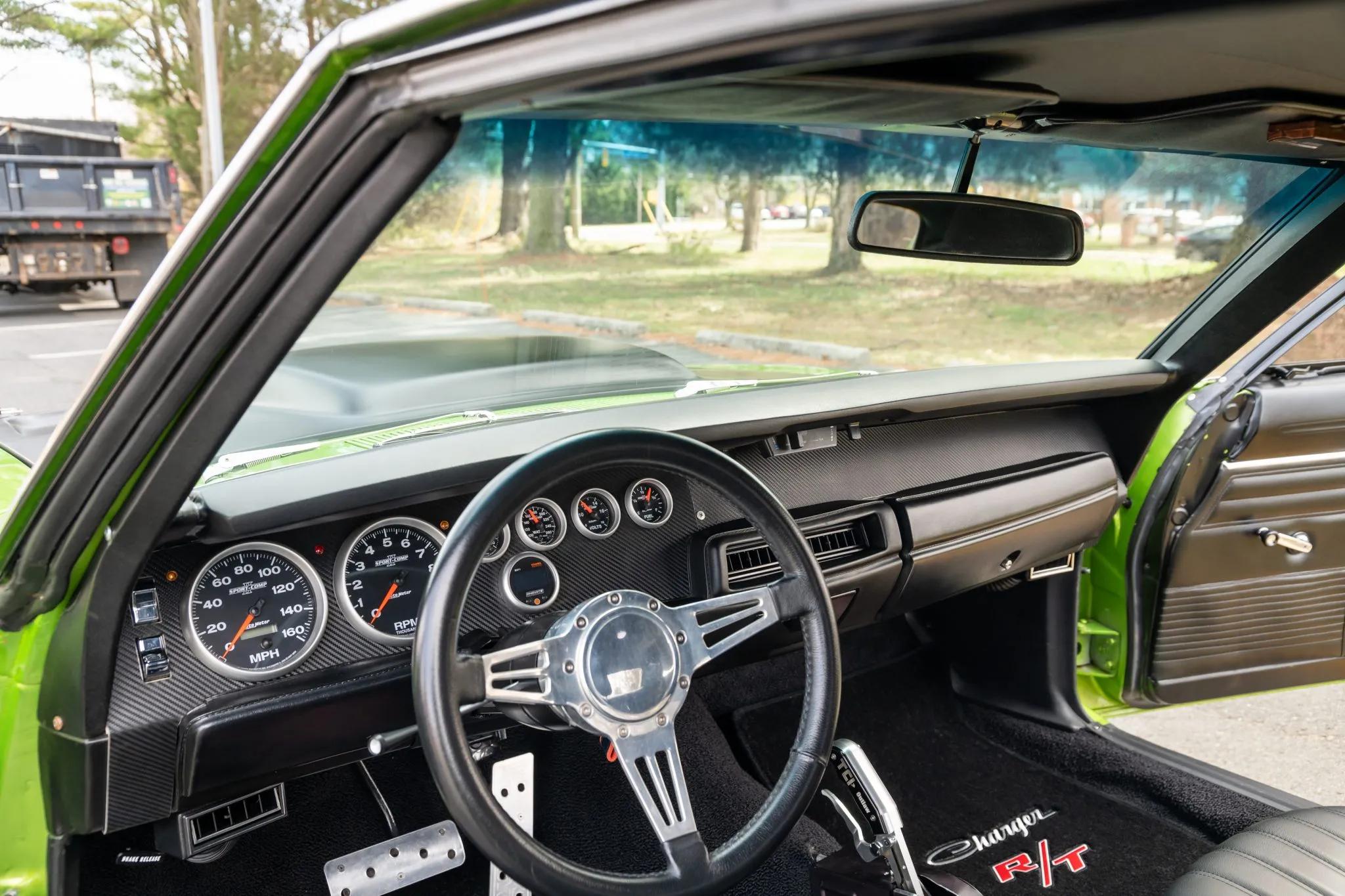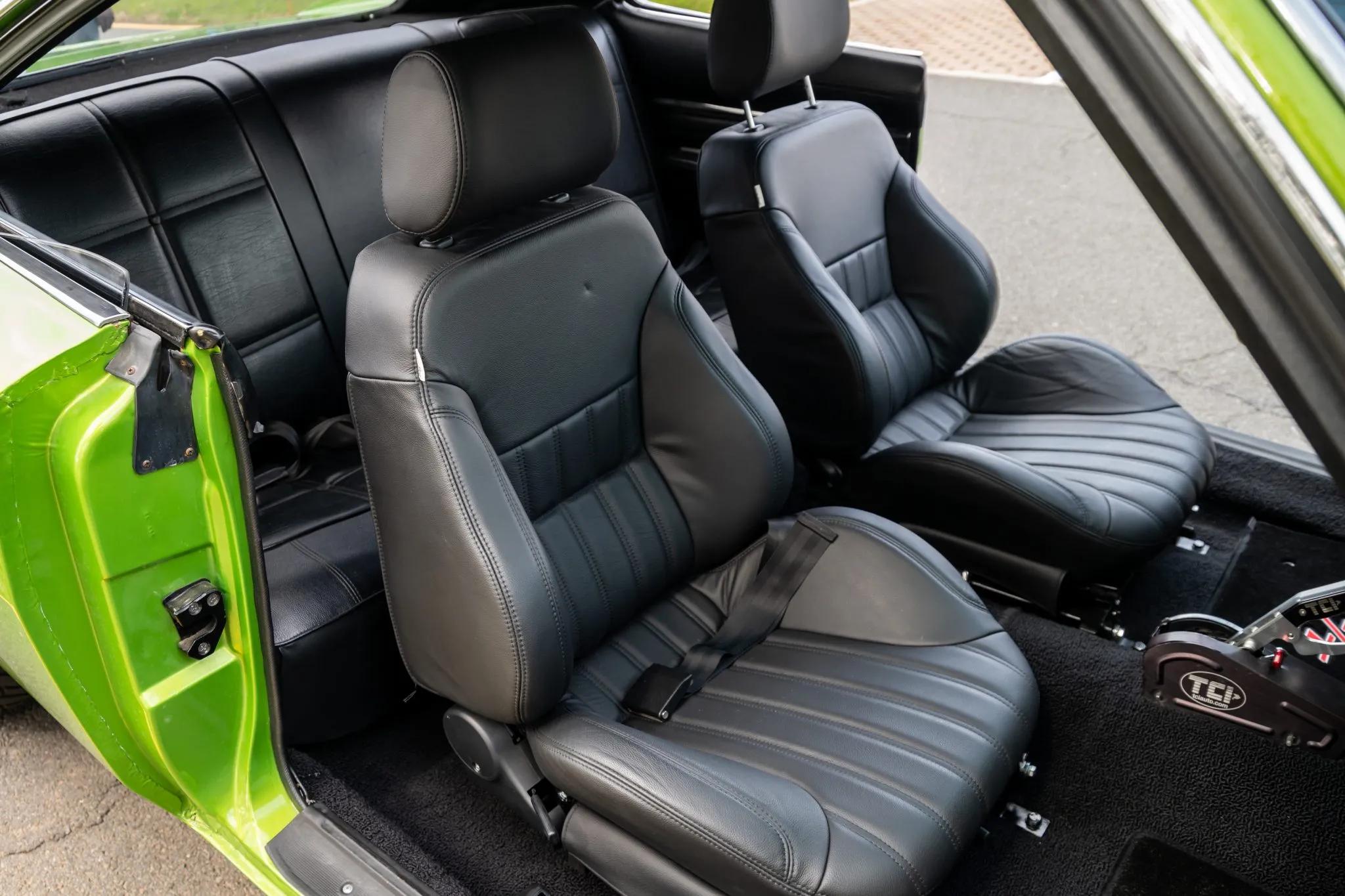 The car is finished in Dodge Viper Snakeskin Green with black R/T stripes and a black interior. Equipment includes Procar front bucket seats, a vinyl-trimmed rear bench, lap belts, Billet Specialties 15" wheels, Wilwood four-wheel disc brakes, Firm Feel front suspension components, CalTracs rear traction bars, a 3" dual exhaust system, scooped black hood, electric headlamp doors, sequential LED taillights, and tinted glass.