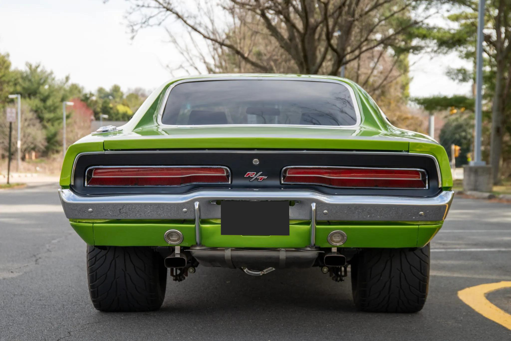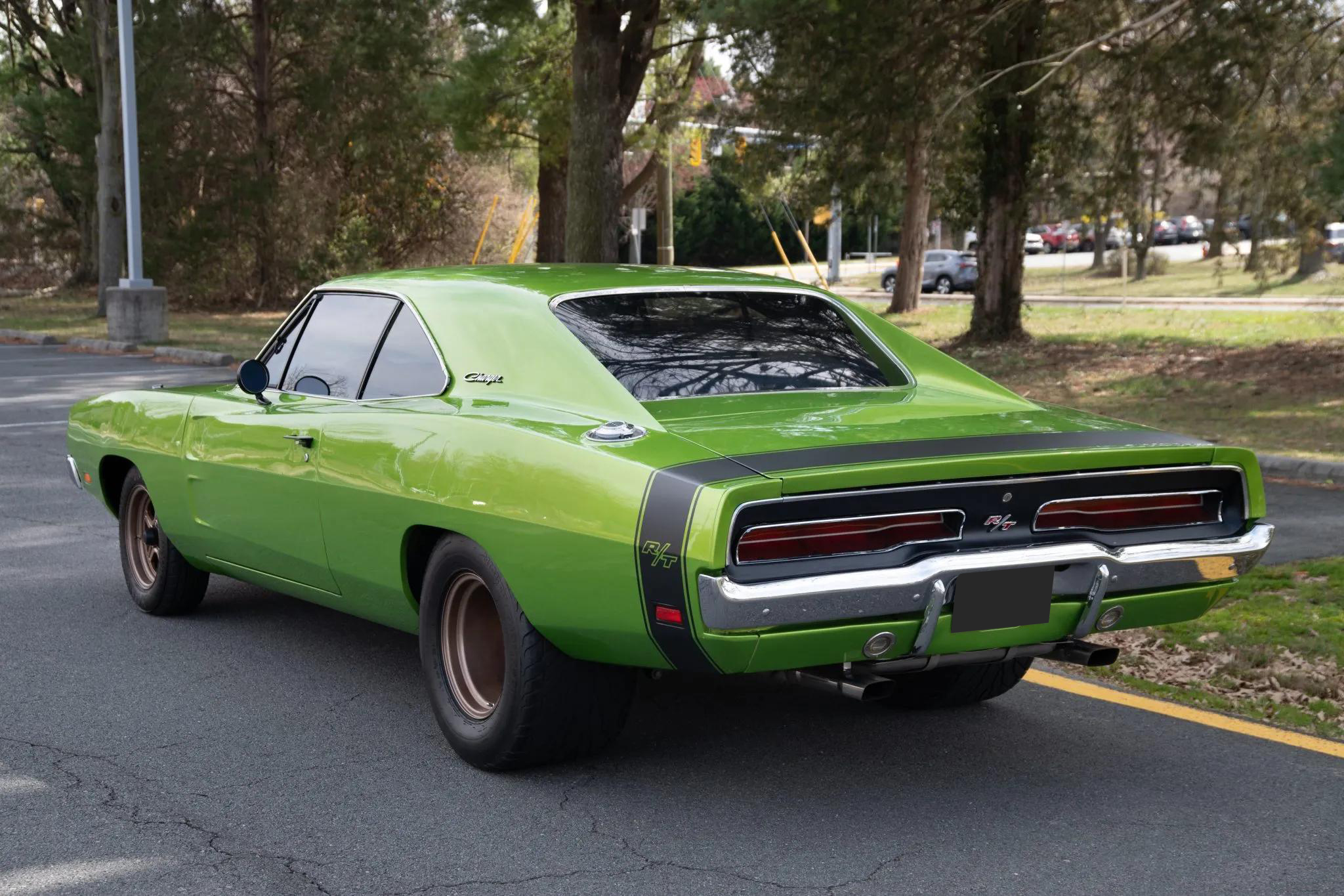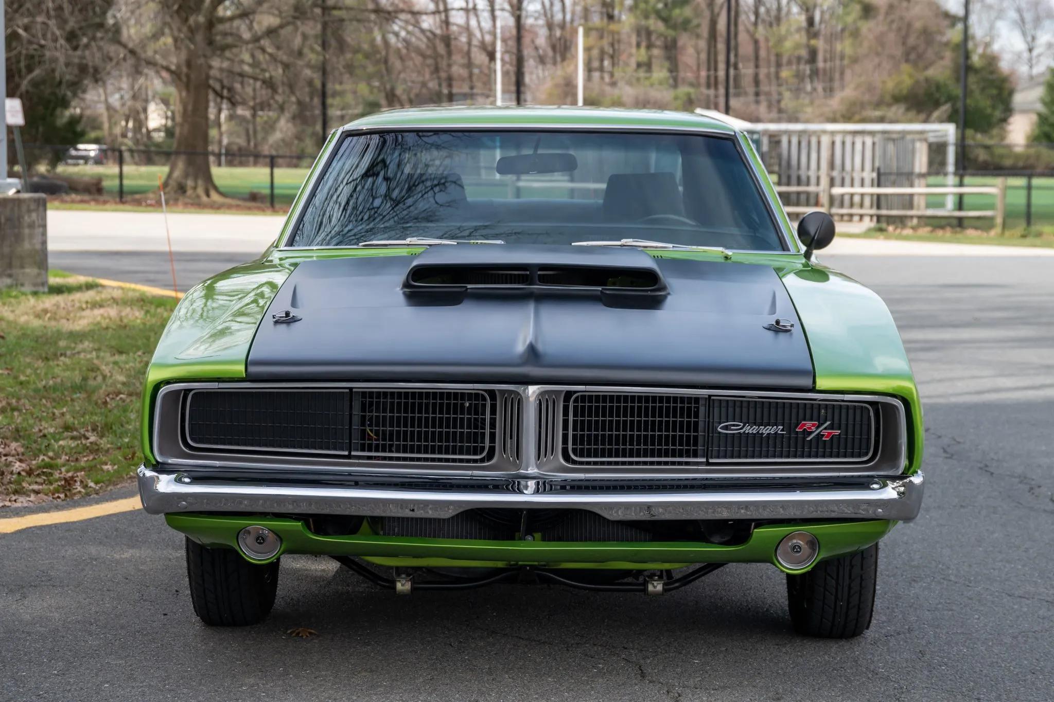 The car is finished in Dodge Viper Snakeskin Green with black R/T stripes and a black interior. Equipment includes Procar front bucket seats, a vinyl-trimmed rear bench, lap belts, Billet Specialties 15" wheels, Wilwood four-wheel disc brakes, Firm Feel front suspension components, CalTracs rear traction bars, a 3" dual exhaust system, scooped black hood, electric headlamp doors, sequential LED taillights, and tinted glass.