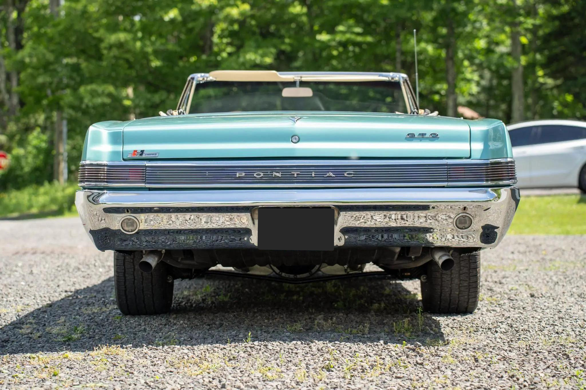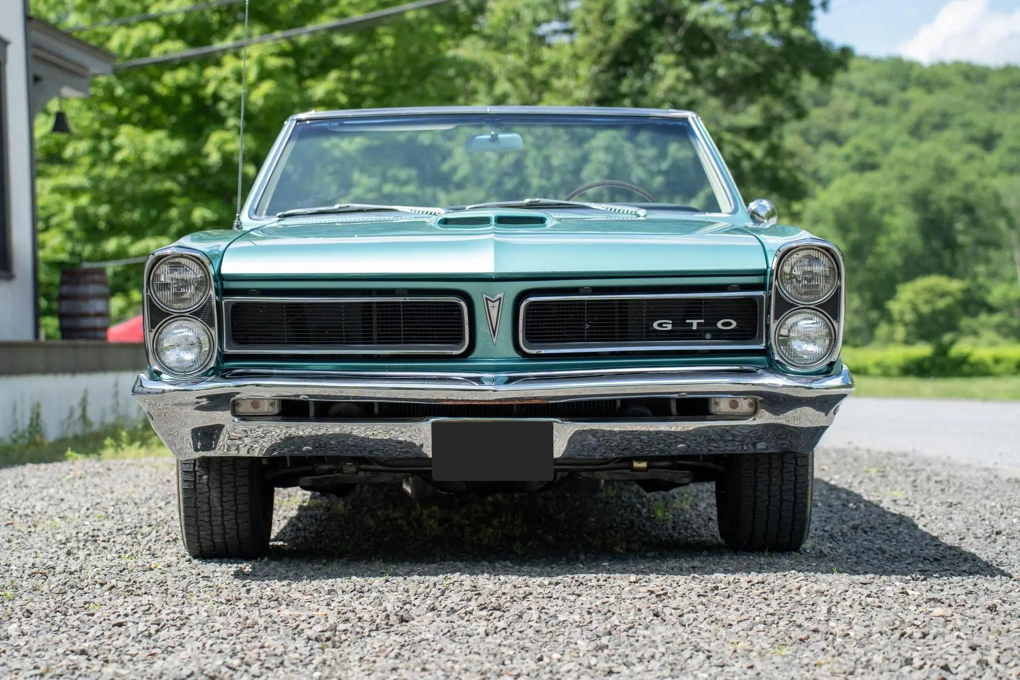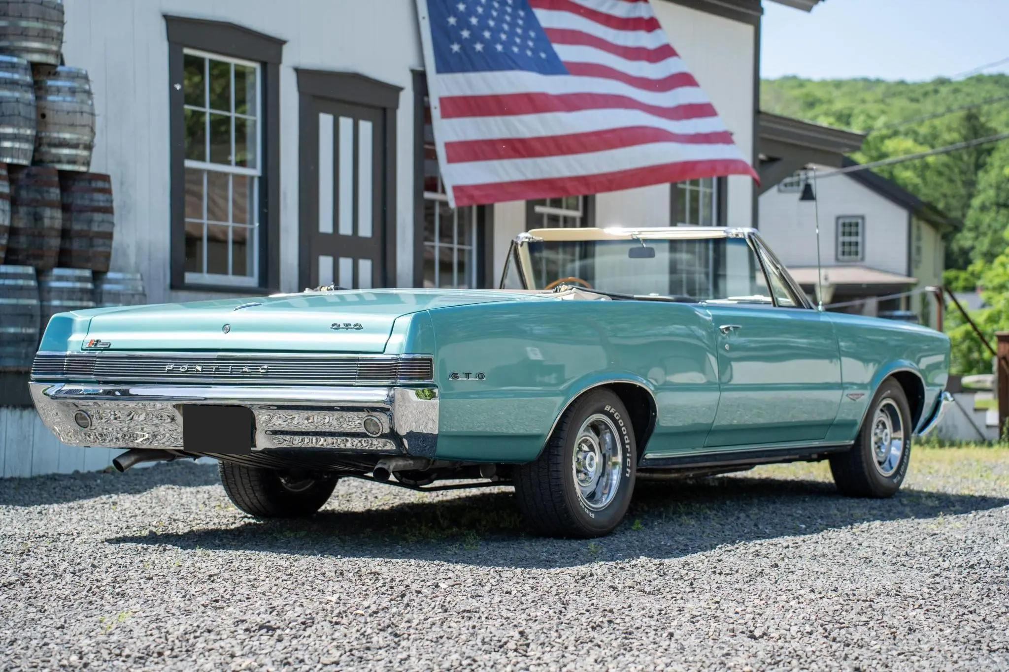 This 1965 Pontiac LeMans convertible is powered by a 389ci V8 with triple carburetors, paired with a four-speed M20 manual transmission and a 3.55:1 limited-slip differential. The car is finished in Reef Turquoise over Parchment vinyl and features a white soft top, power steering, power-assisted front disc brakes, 14" Rally wheels, and a center console.