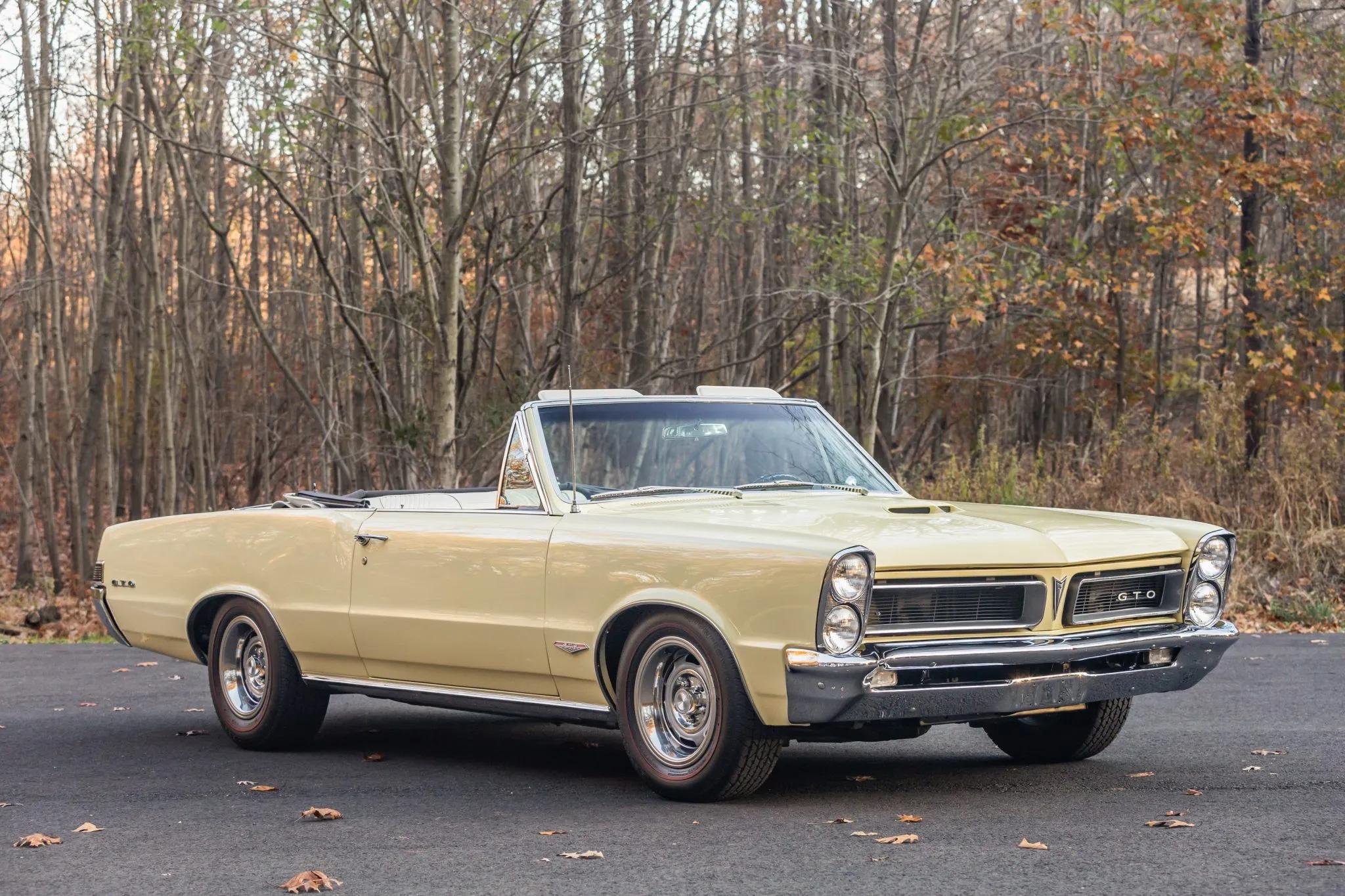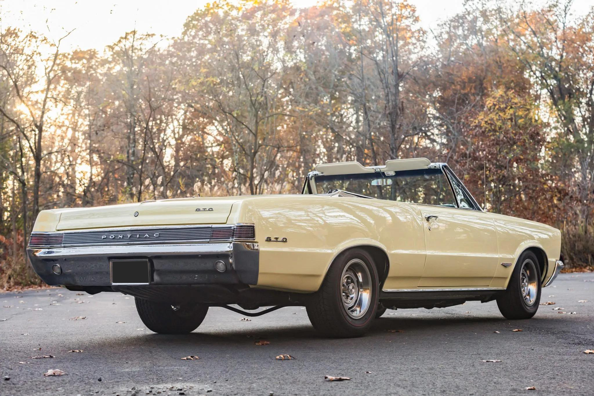 This 1965 Pontiac LeMans convertible was refurbished in 2012 in the style of a contemporary GTO. It is powered by a 455ci V8 with dual four-barrel carburetors, an Offenhauser intake manifold, and Doug's coated headers, paired with a Tremec TKO 600 five-speed manual transmission and a Moser 12-bolt rear end with an Eaton limited-slip differential.