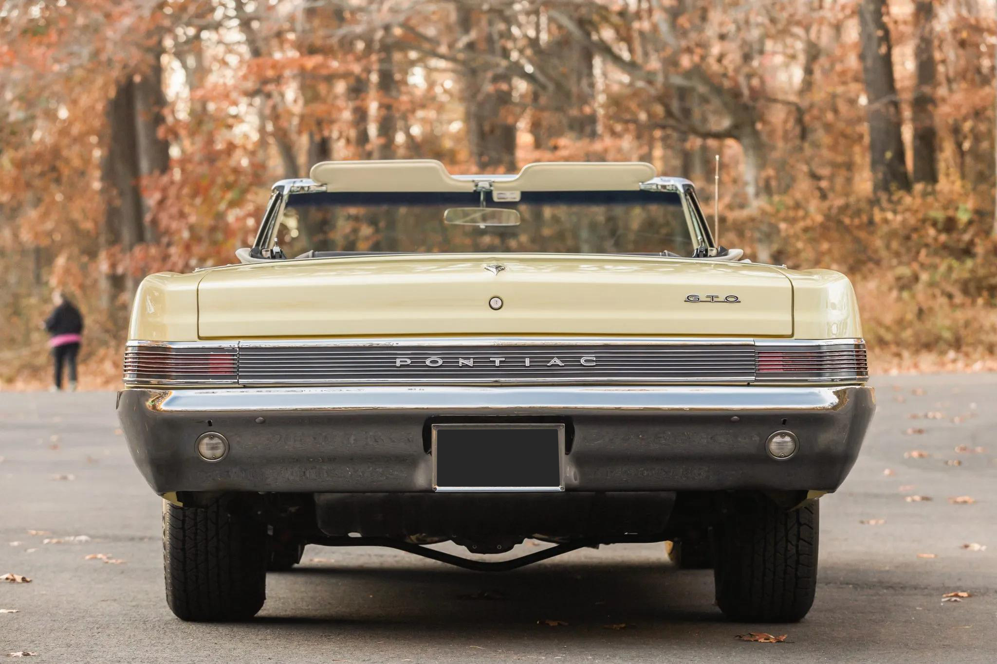 The car is finished in Mayfair Maize with a Parchment soft top, twin-scoop hood, stacked headlights, GTO badging, and chrome bumpers. It rides on 15" Rally-style wheels with redline tires and Wilwood four-wheel disc brakes. The suspension was overhauled with front and rear sway bars, lowering springs, Koni shocks, and Del-A-Lum bushings. Power steering is equipped with a Moog linkage.