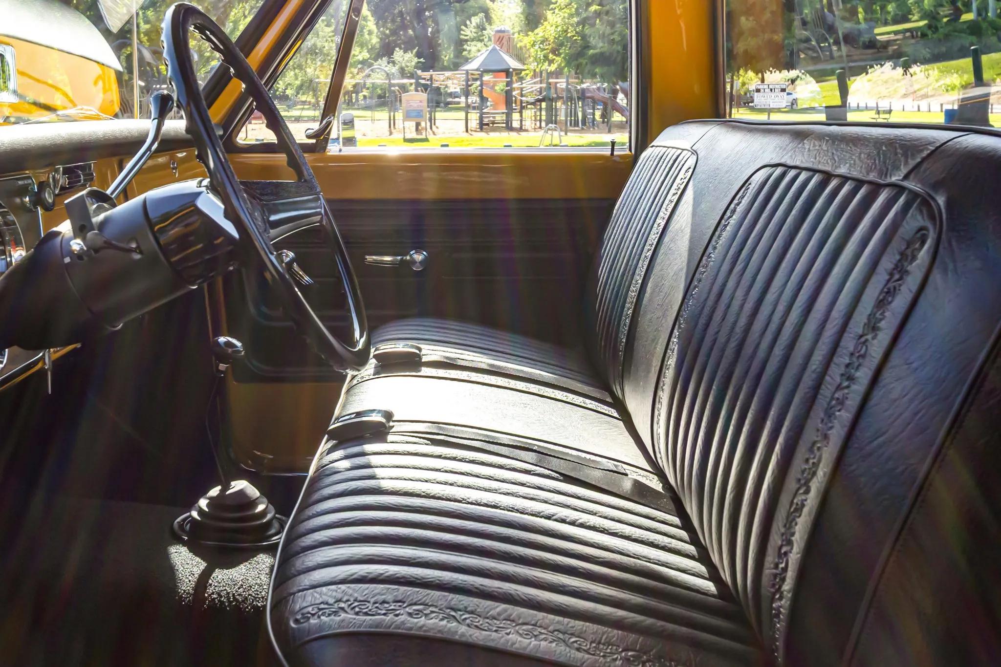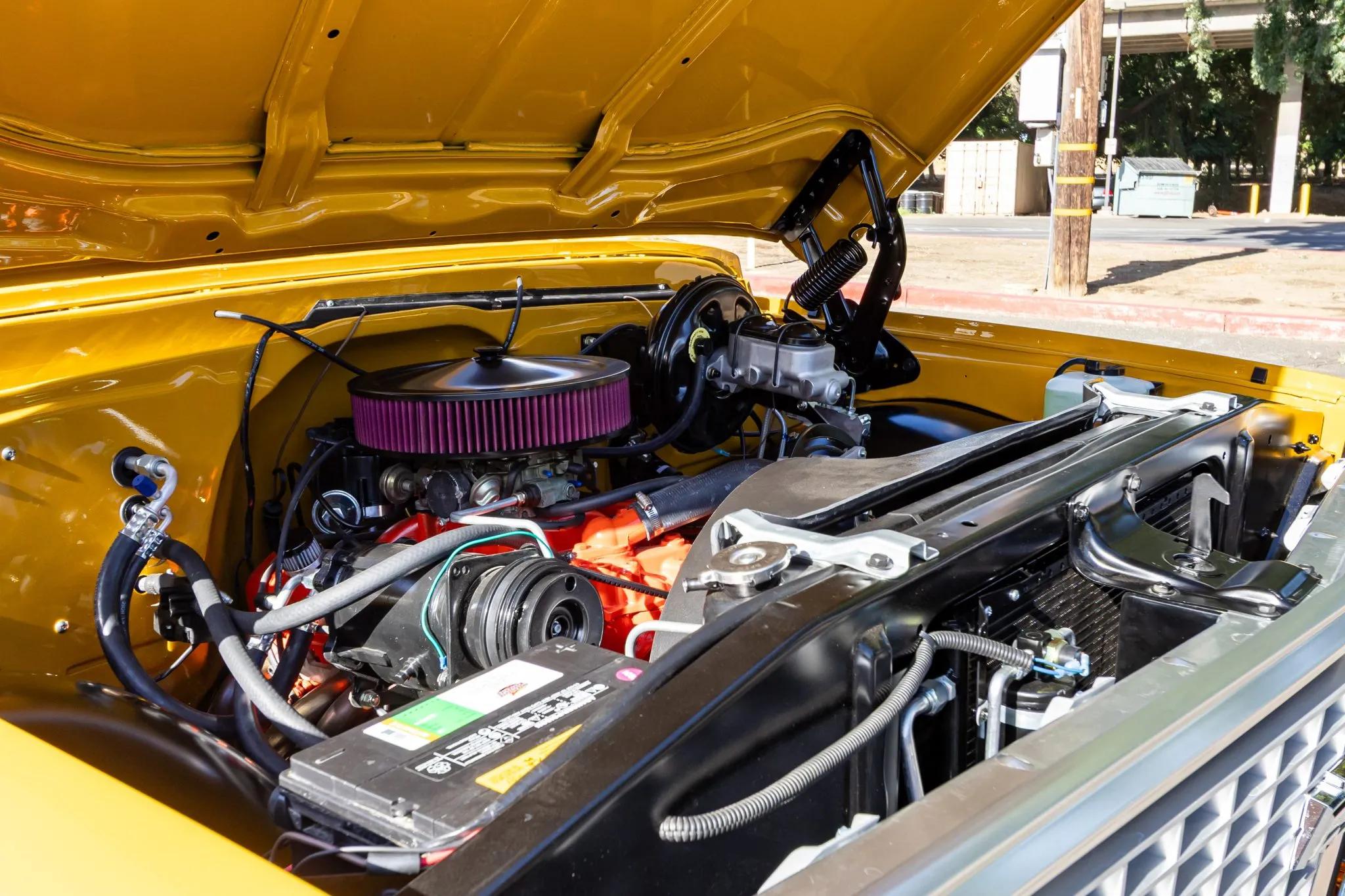 The truck is finished in Ochre and White, with the cab stripped, rust repaired, and body panels replaced as needed. The interior is retrimmed in black vinyl, with new dash pad, headliner, and carpets, and equipped with Vintage Air climate control. The bench seat was overhauled, and the two-spoke steering wheel frames a 100-mph speedometer, 5k-rpm tachometer, and auxiliary gauges.